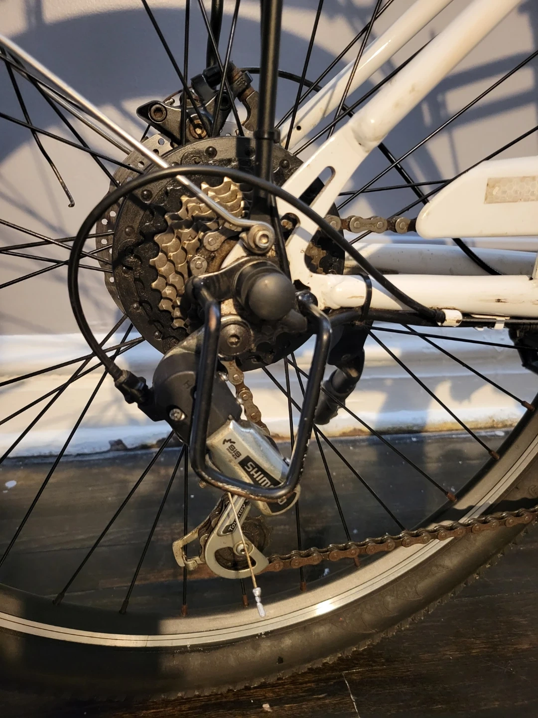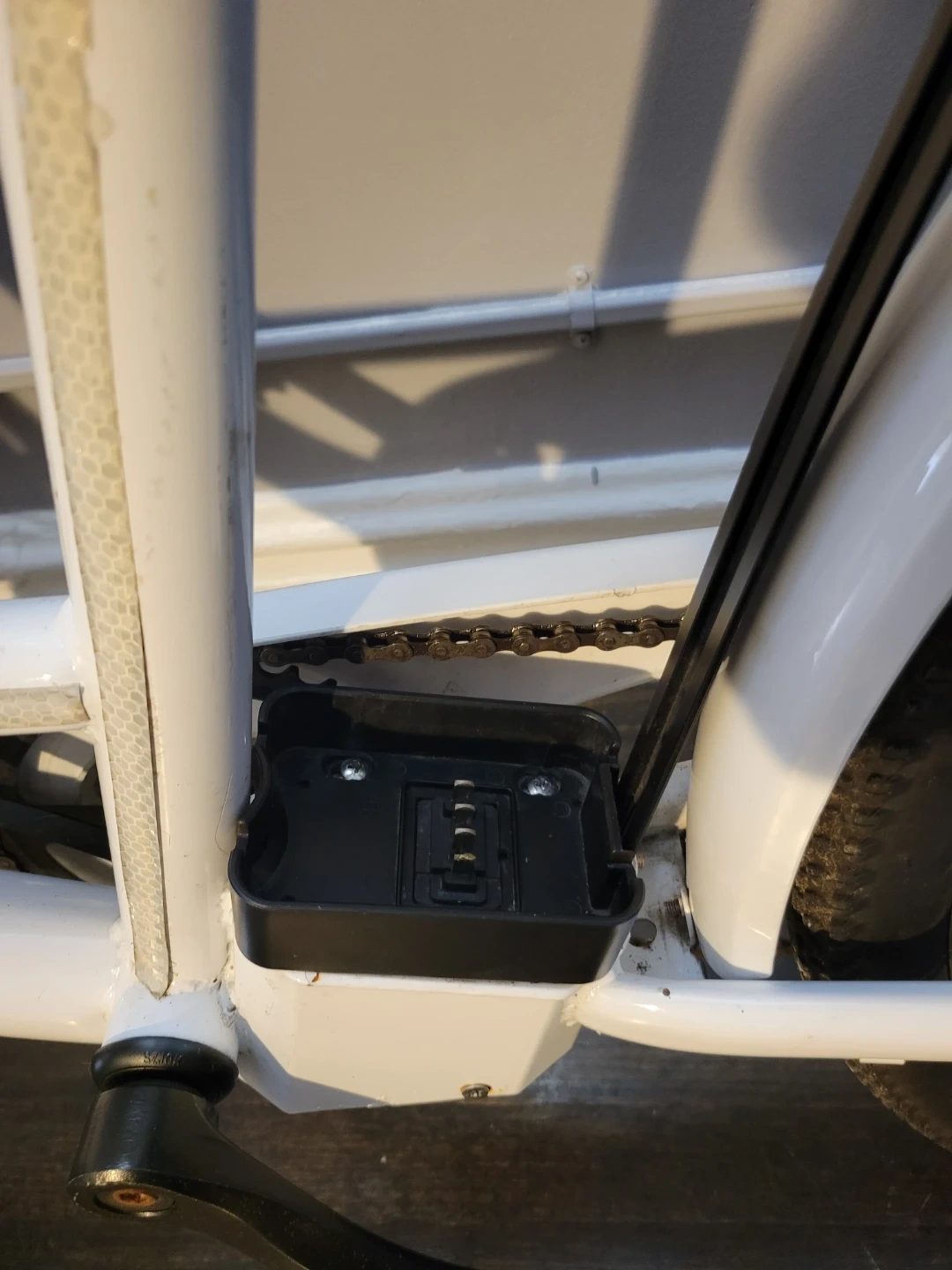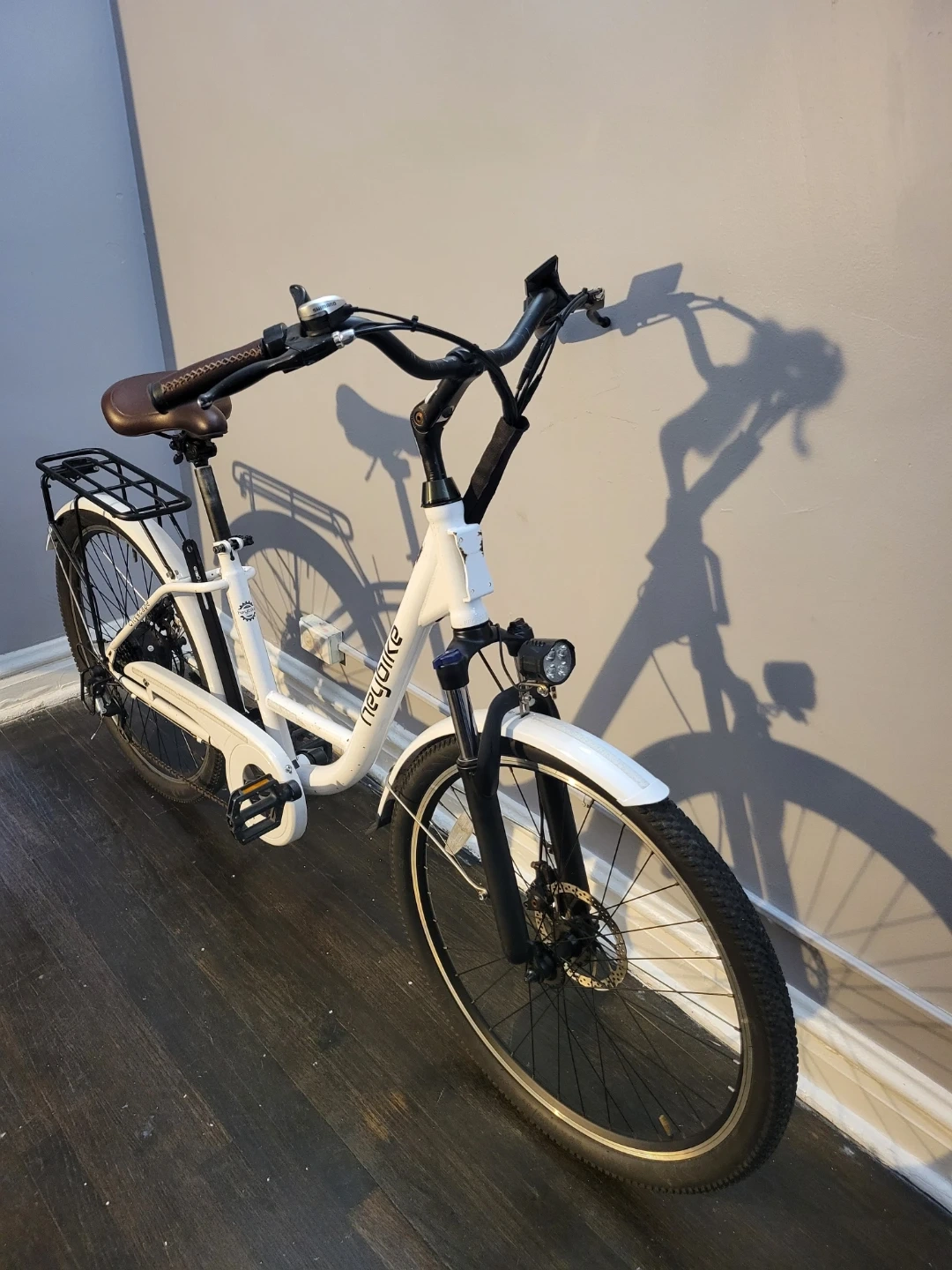 This is a white Heybike electric city cruiser bike. It's a step-through frame design. It includes a rear rack and front headlight.