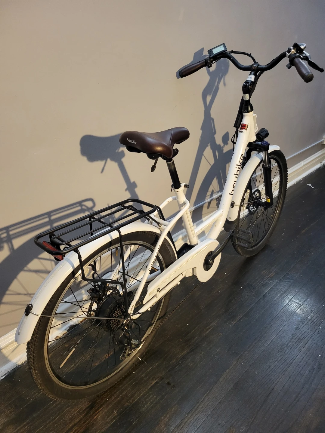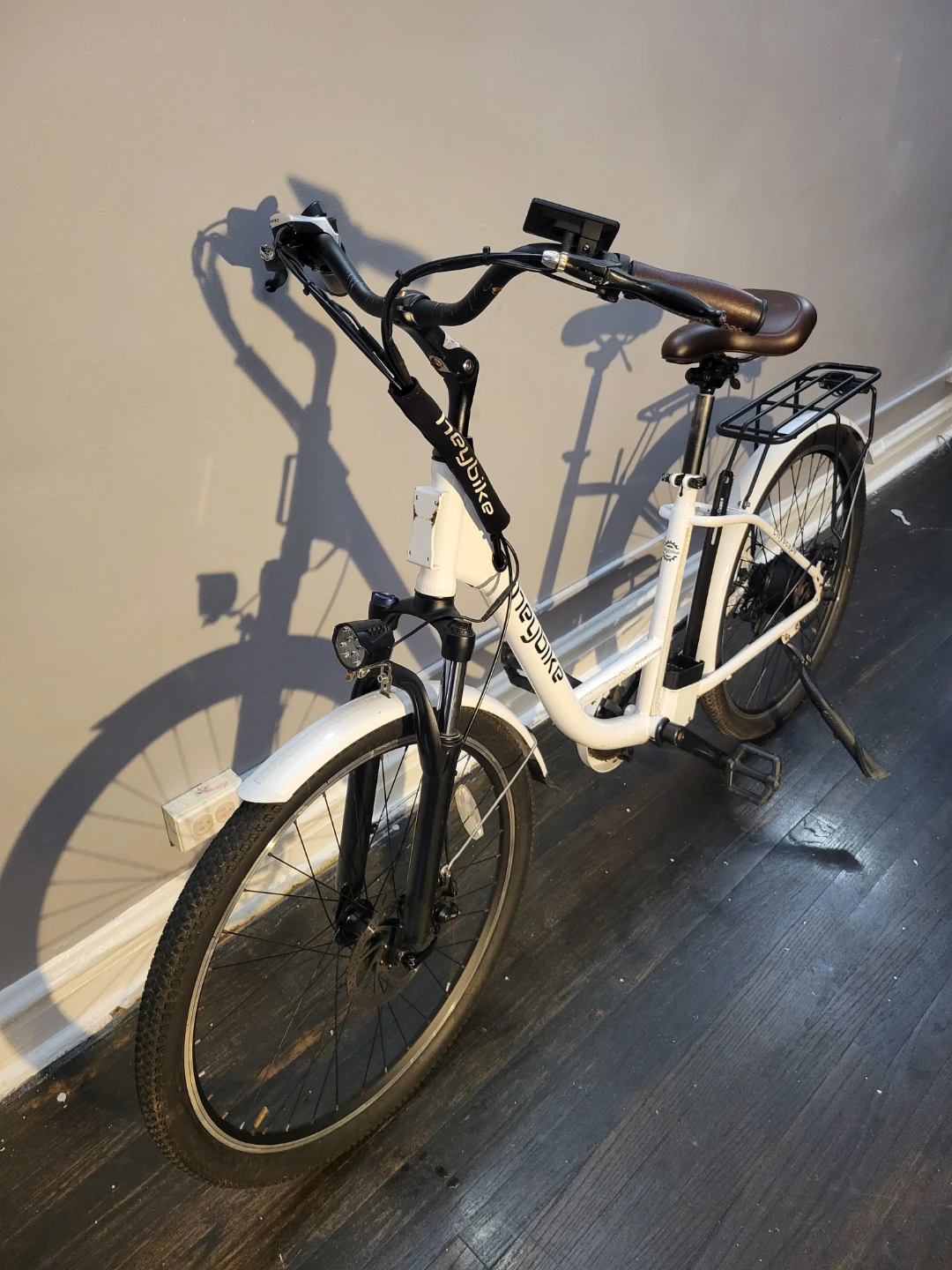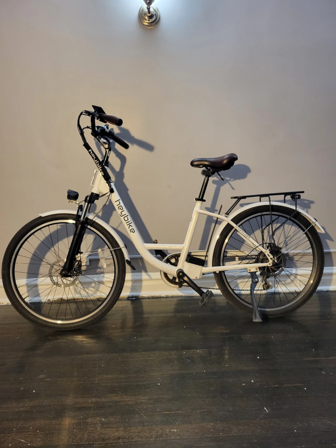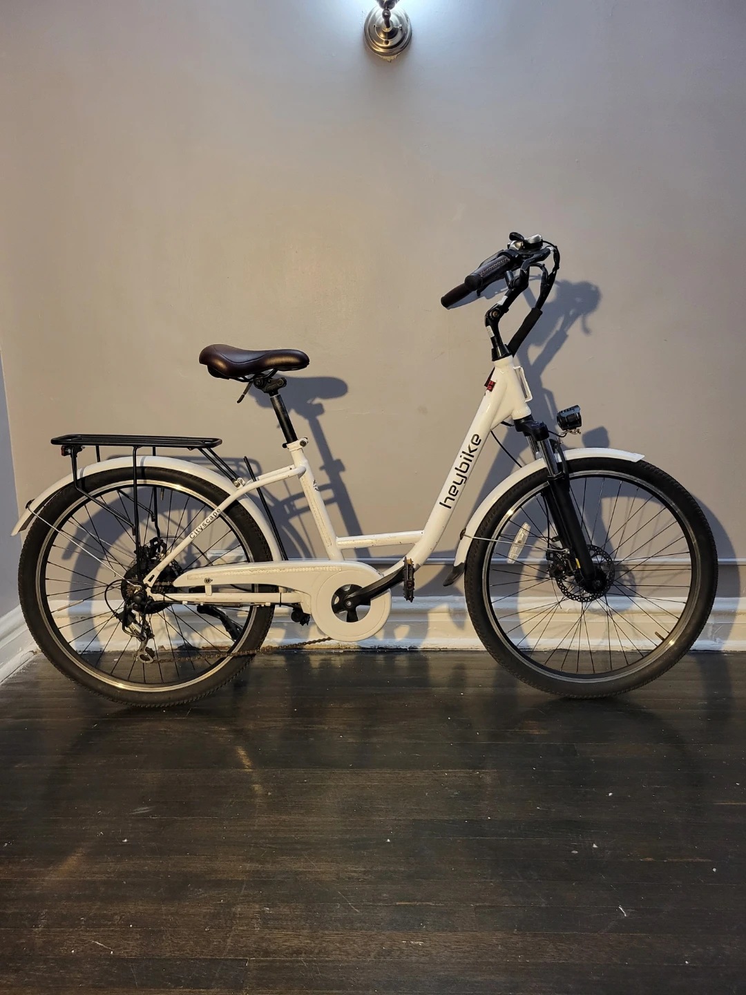 This is a white Heybike electric city cruiser bike. It's a step-through frame design. It includes a rear rack and front headlight.