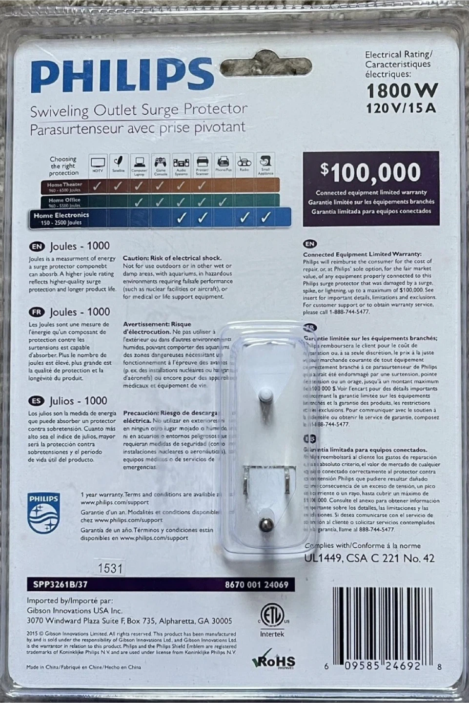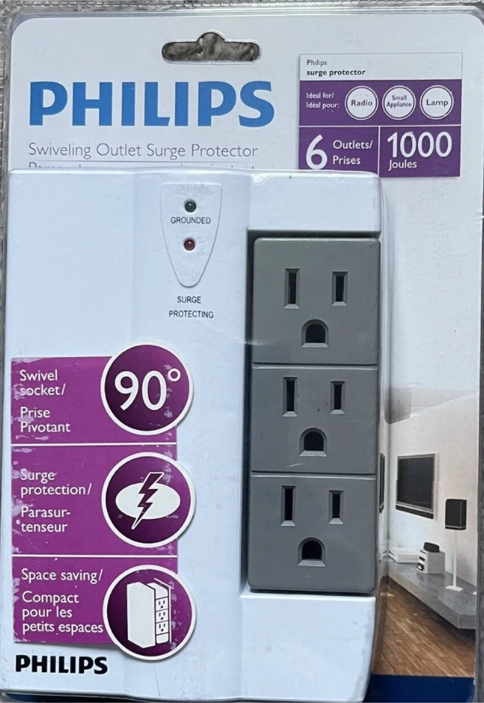 Selling a Philips swiveling outlet surge protector. It features 6 outlets and 1000 joules of surge protection. It's ideal for home theater, home office, and home electronics from 150-2500 joules. It can handle 1800 W or 120 V/15 A.
