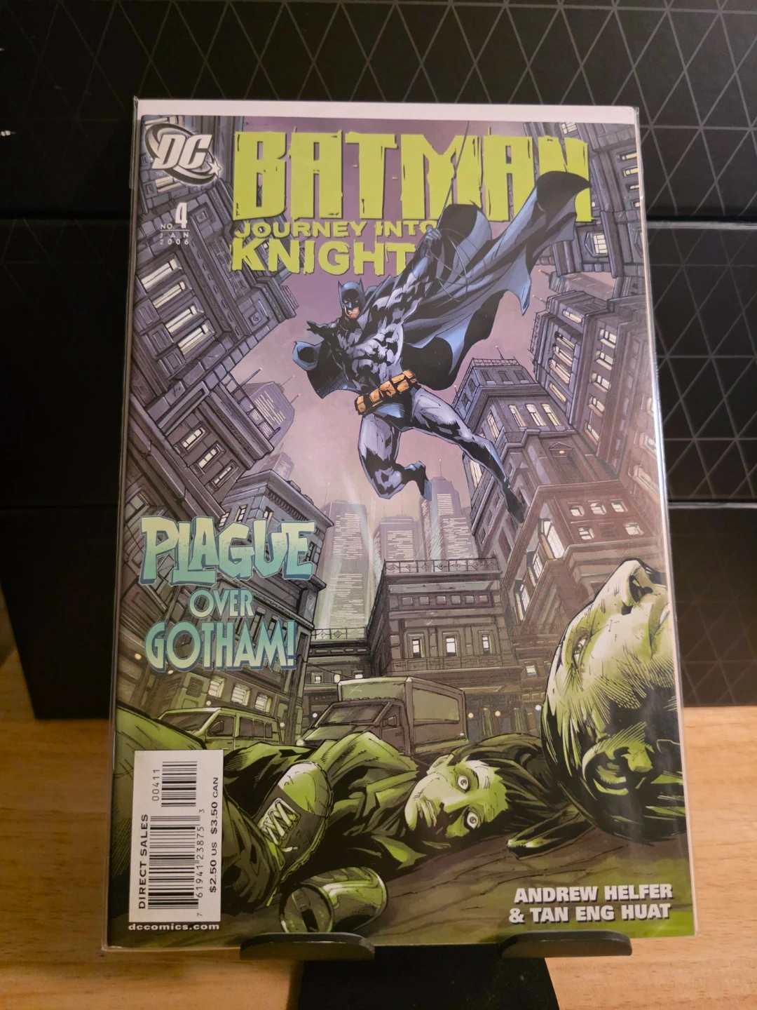 Selling a Batman Journey Into Knight, issue number 4 comic book! The cover art shows Batman soaring over Gotham City, with the title "Plague Over Gotham!" The comic is by Andrew Helfer & Tan Eng Huat.