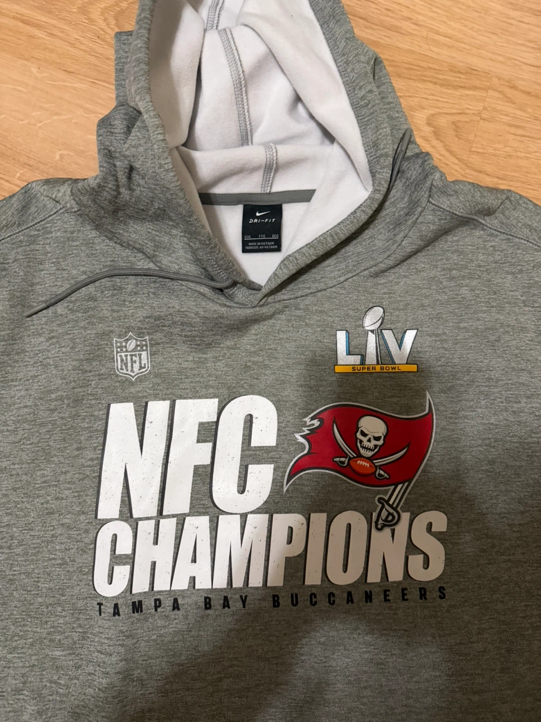 Grey Nike Dri-FIT hoodie celebrating the Tampa Bay Buccaneers as NFC Champions for Super Bowl LIV. It's a size XXL. Made in Vietnam.