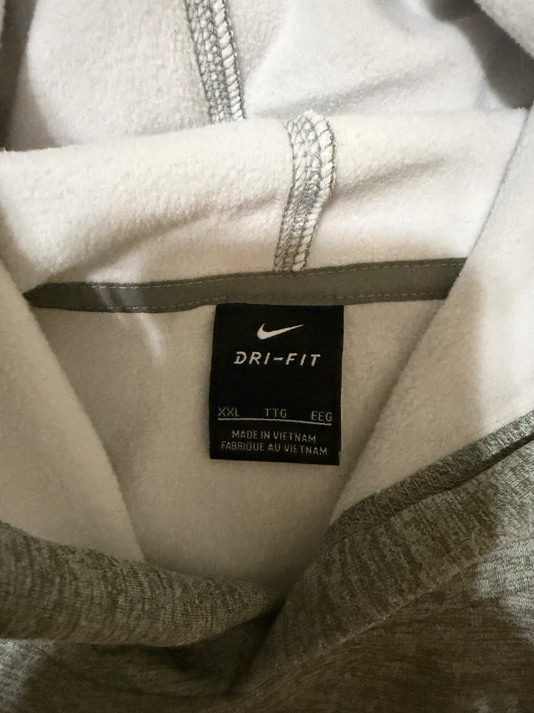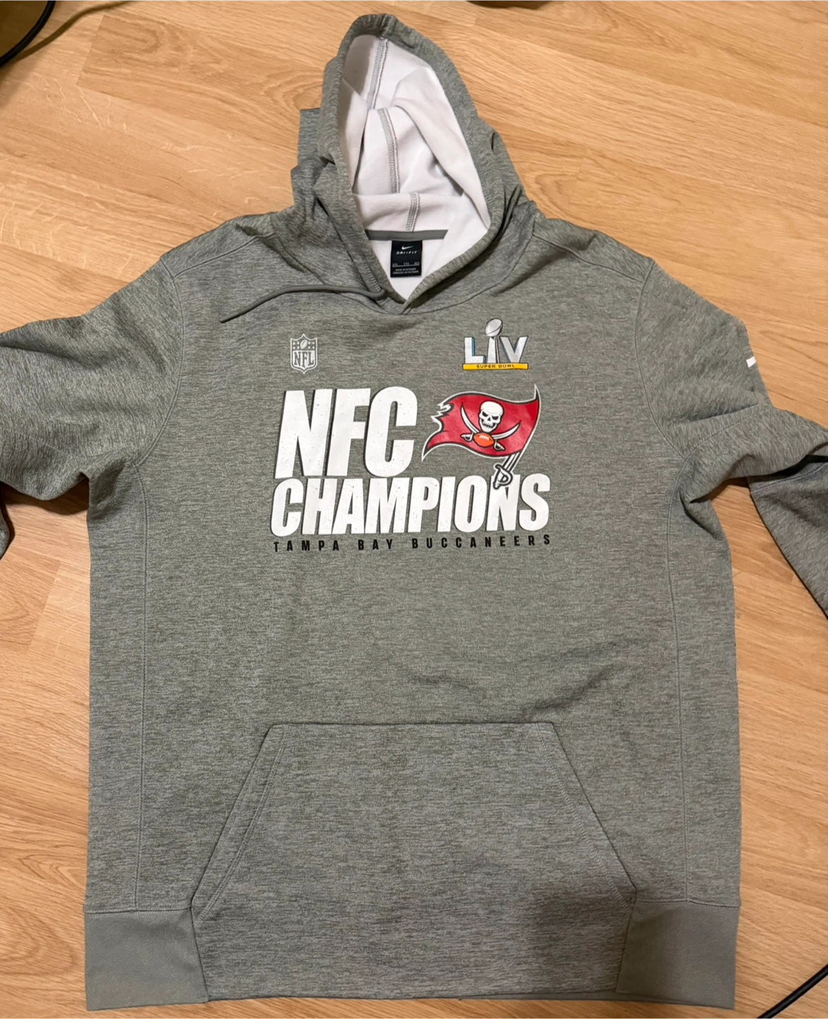 Grey Nike Dri-FIT hoodie celebrating the Tampa Bay Buccaneers as NFC Champions for Super Bowl LIV. It's a size XXL. Made in Vietnam.