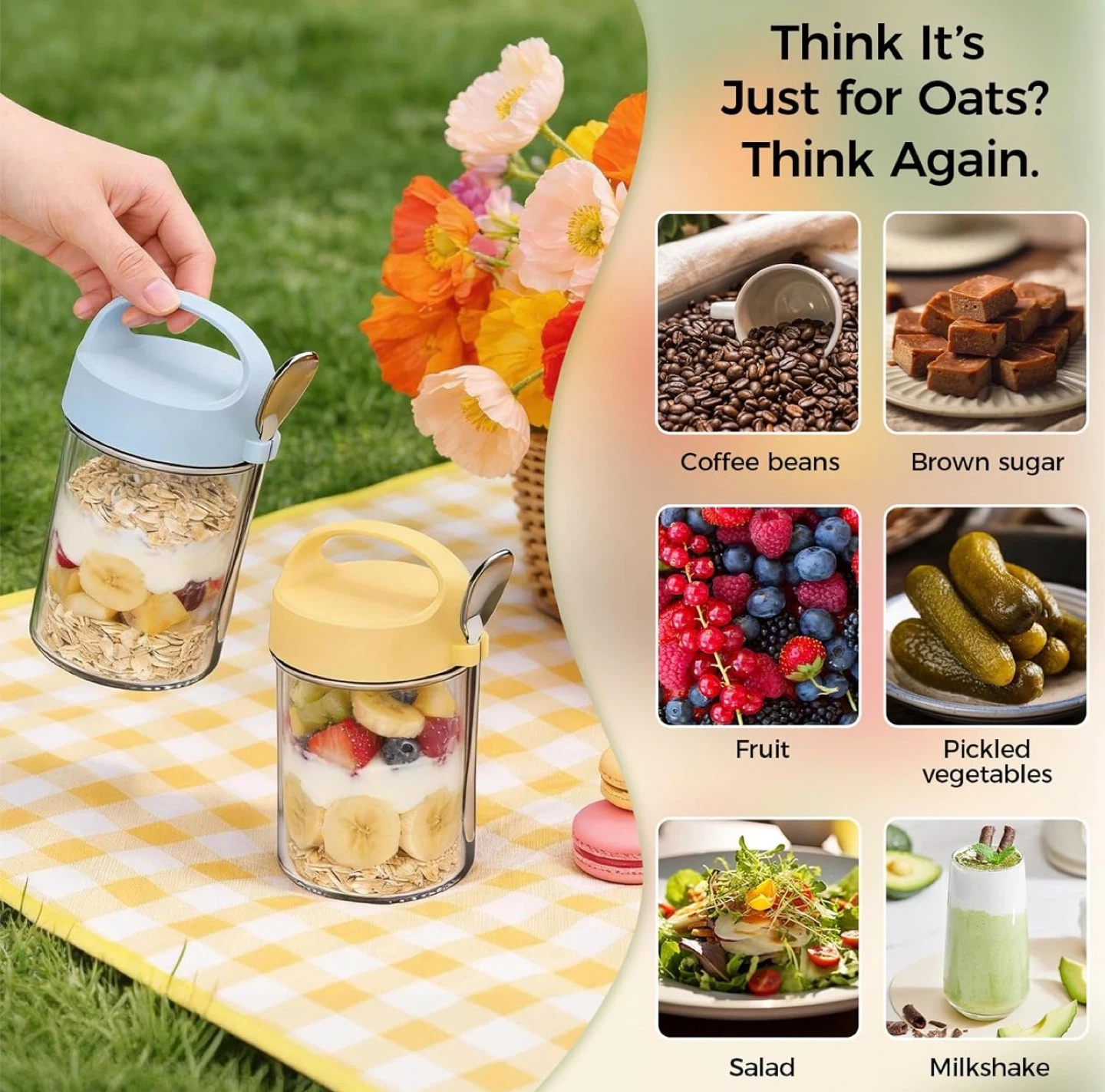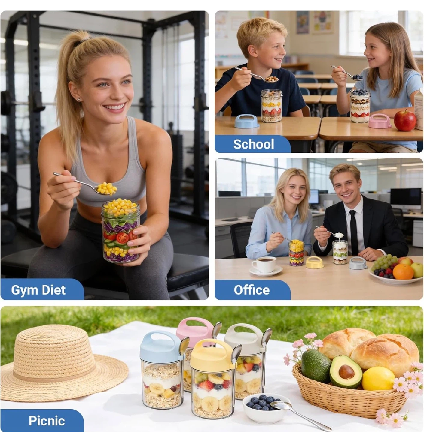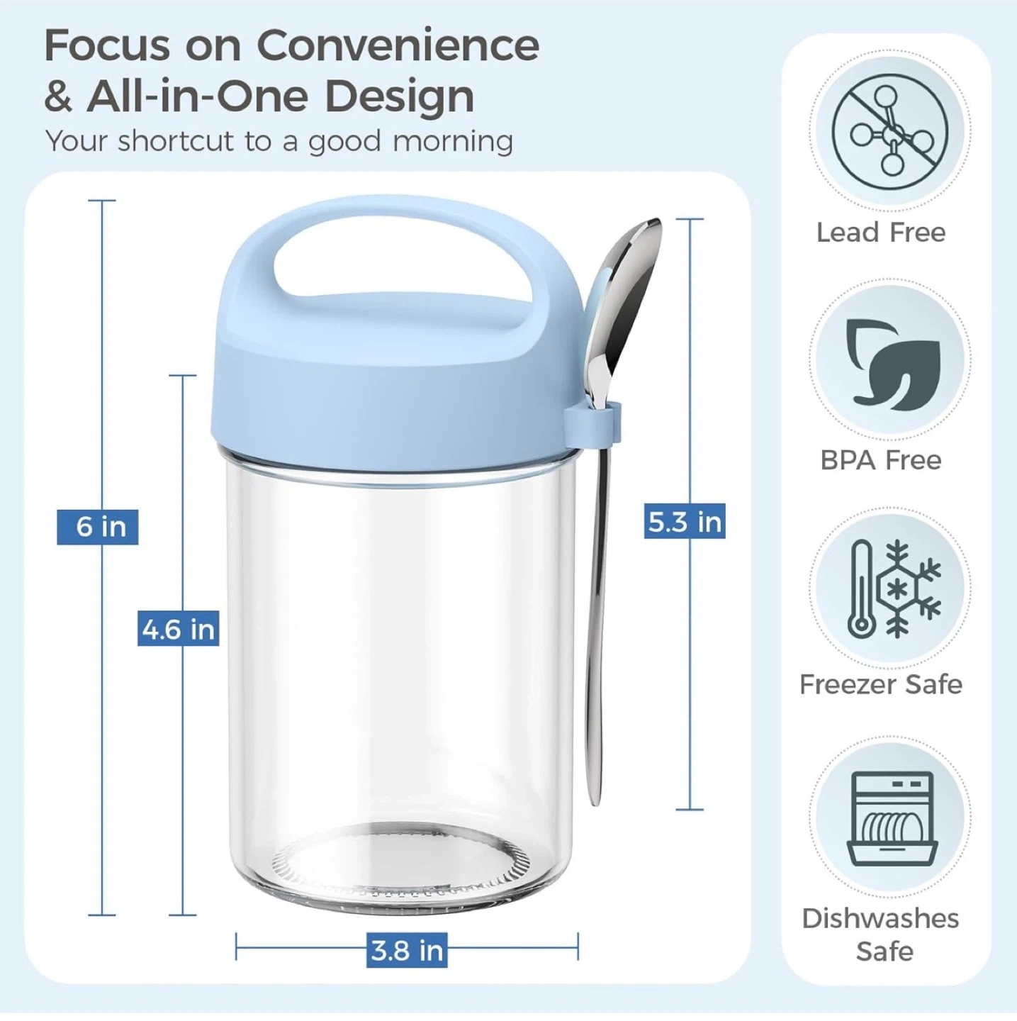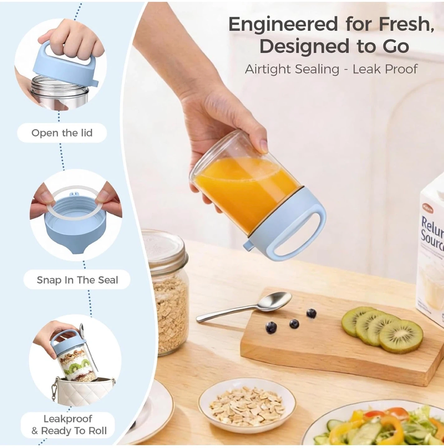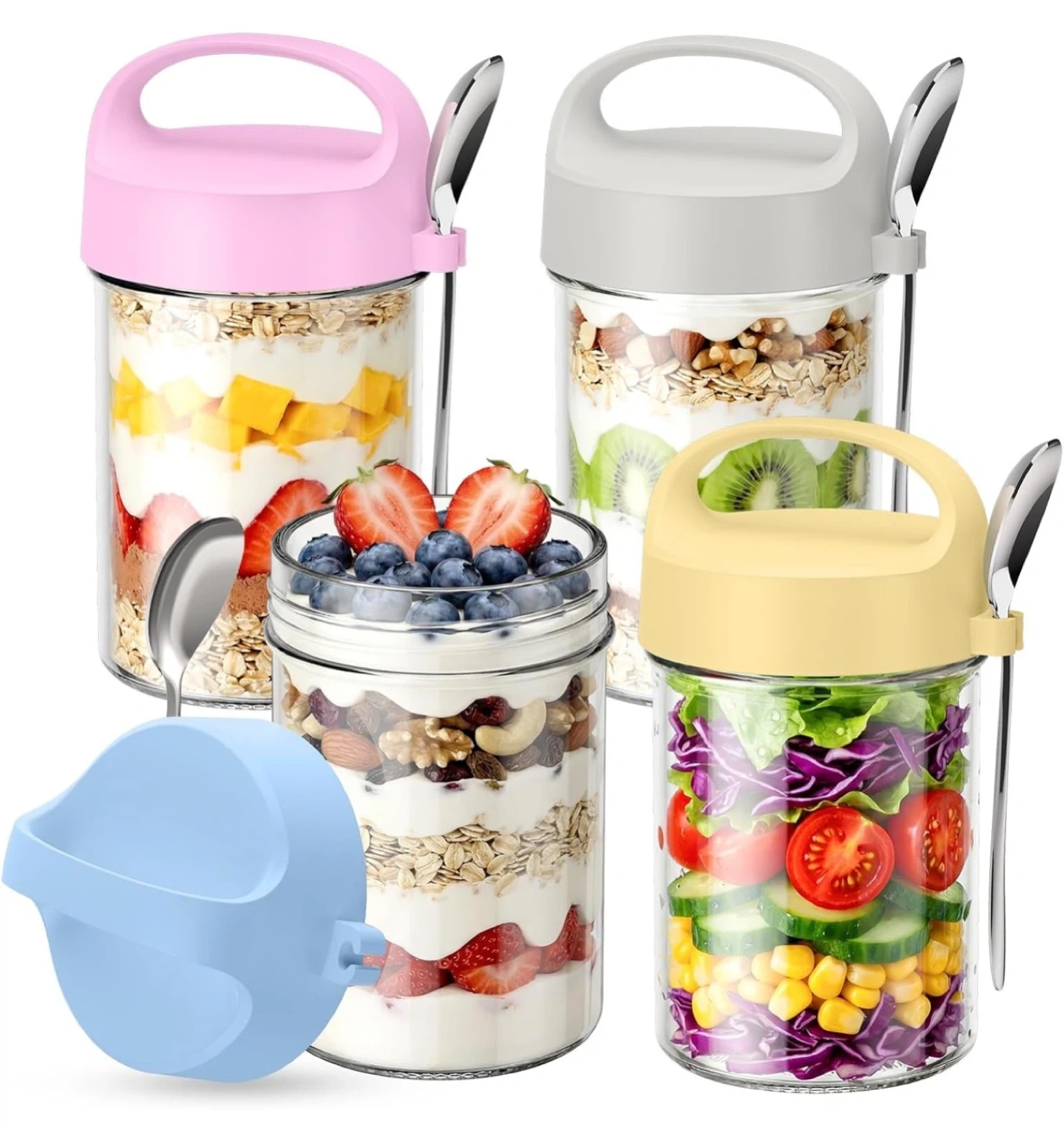 Overnight Oats Containers with Lids and Spoons - 4 Pack 16OZ Mason Jars with Handle Glass Storage Containers with Airtight Lids, Glass Meal Prep Containers Reusable for Yogurt Cereal Fruit Vegetable
