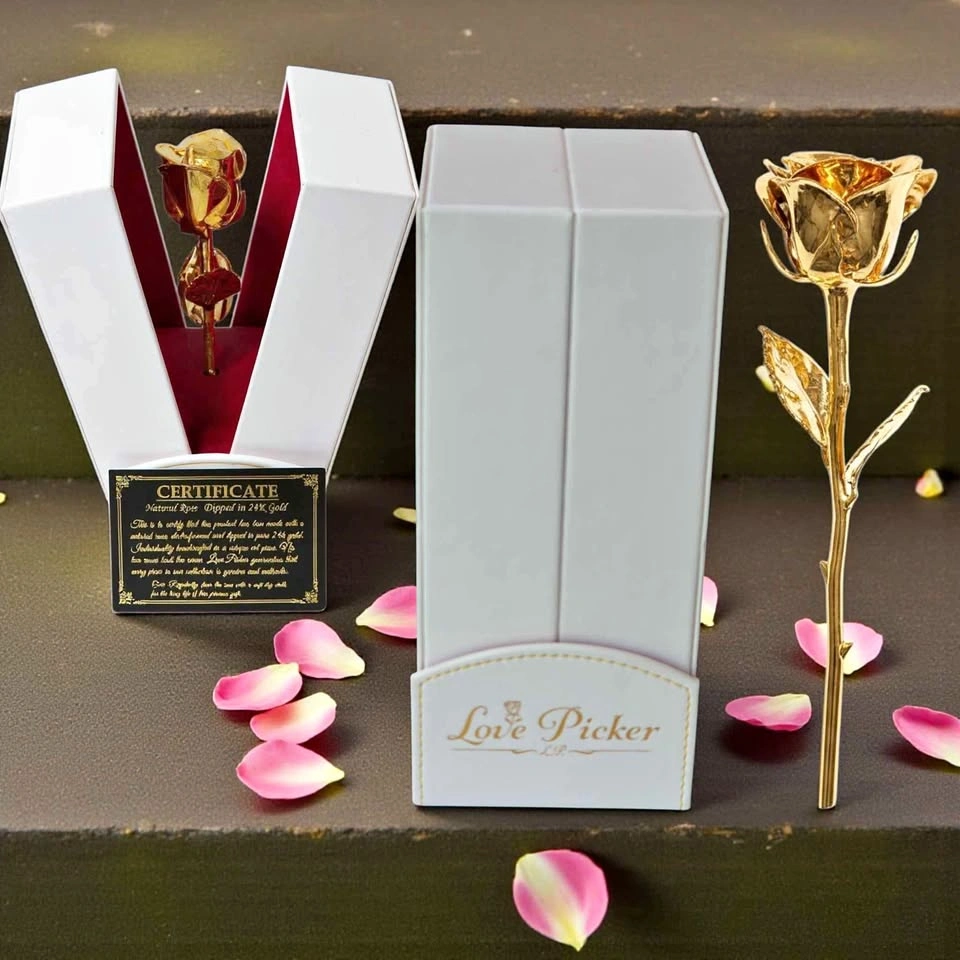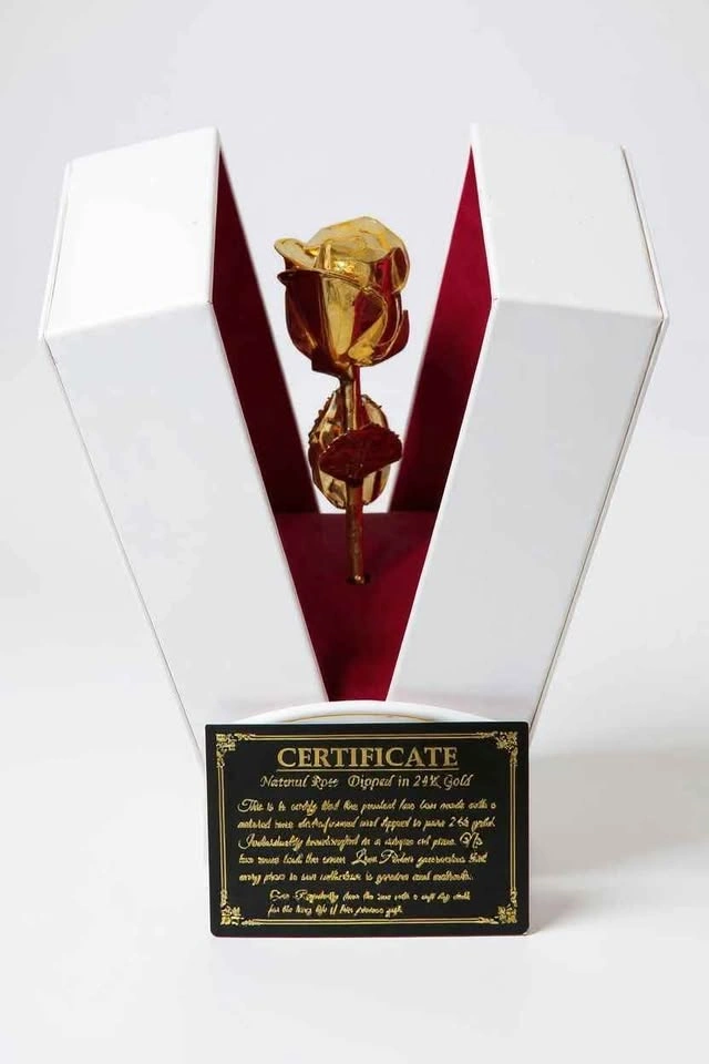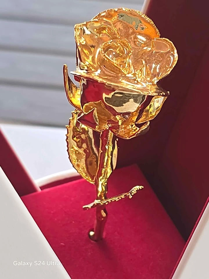 24K gold-dipped rose gift. These roses are made from real roses that are preserved and then dipped in gold.