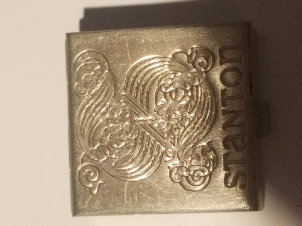 This is a decorative case with an ornate design on one side and the 'Stanton' name embossed. It's made of a silver-tone metal. The interior has two compartments for storage.
