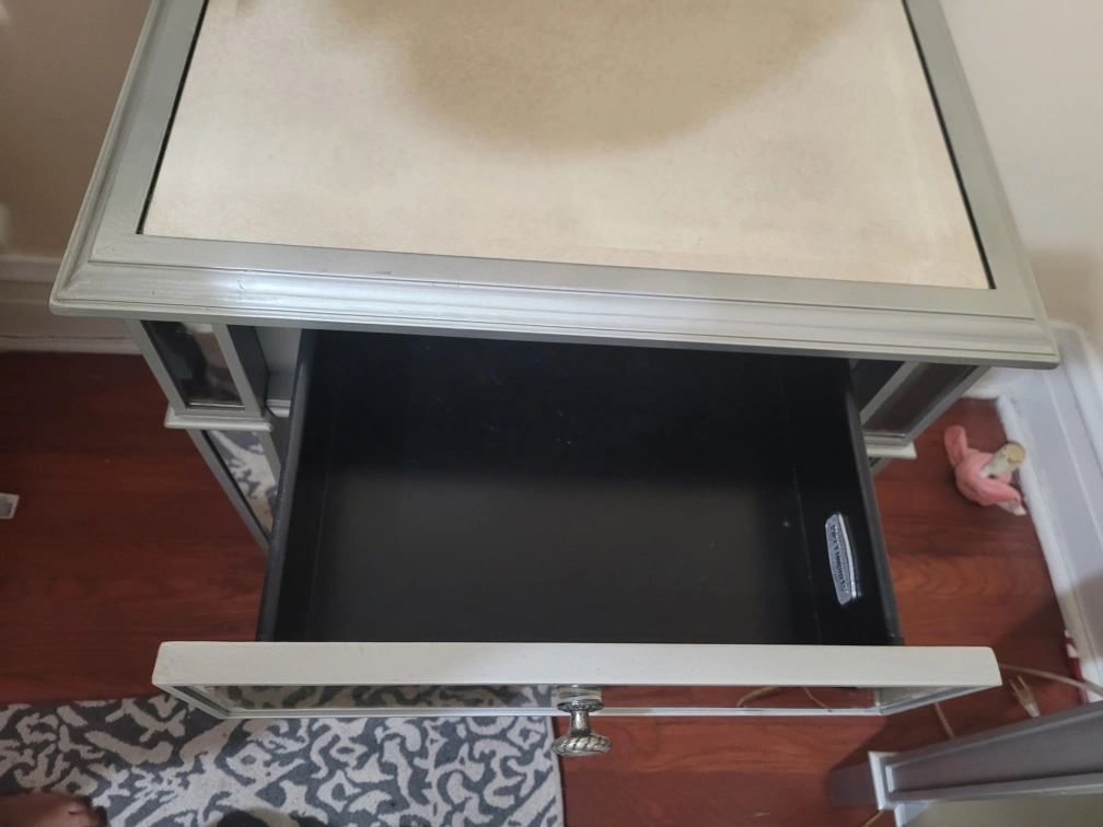 Selling a mirrored nightstand from Pier 1 Imports! It features a drawer and a bottom shelf for extra storage. The nightstand is in good condition and would look great in any bedroom, living room or salon! Price is firm! Cash only. Thanks