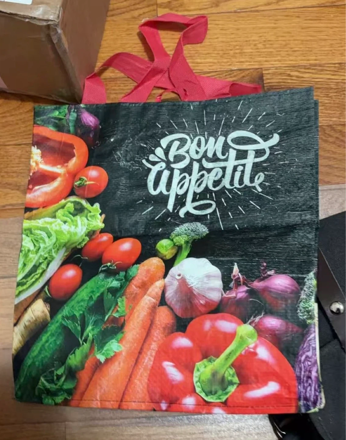 This reusable tote bag features a vibrant "Bon Appetit" design with fresh vegetables. It's made of durable material with red handles. Perfect for carrying groceries or everyday items!