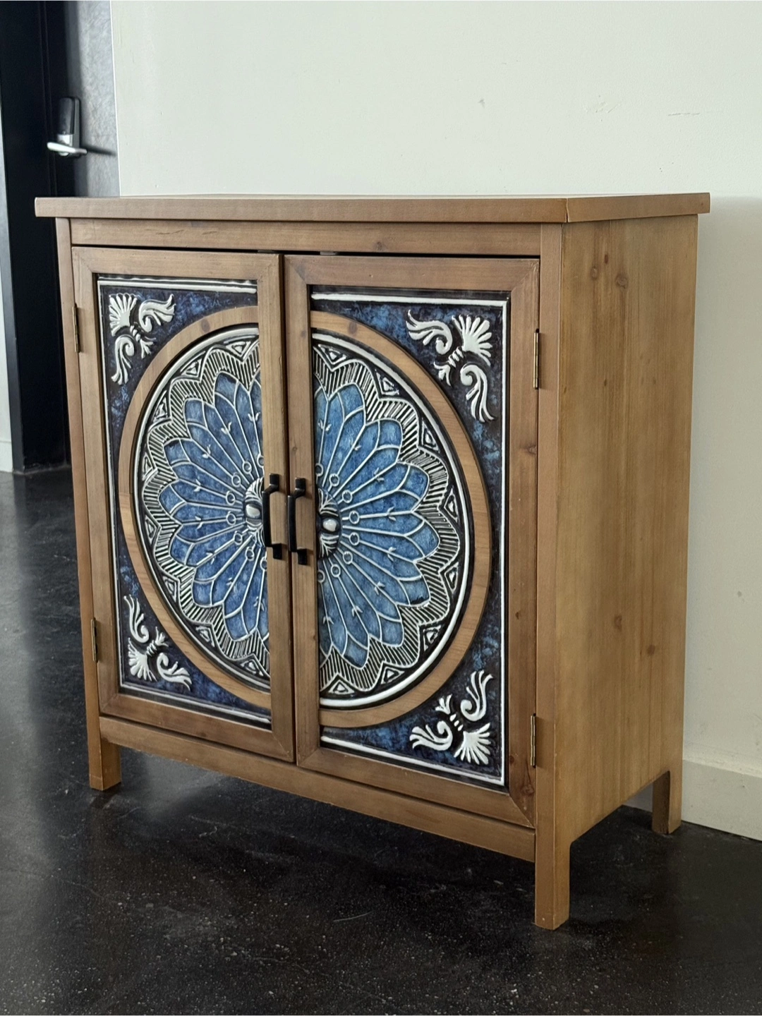 Crafted with wood. Features a beautiful blue patterned design on the front doors. It's the perfect piece to keep your living area tidy, while adding a touch of style.