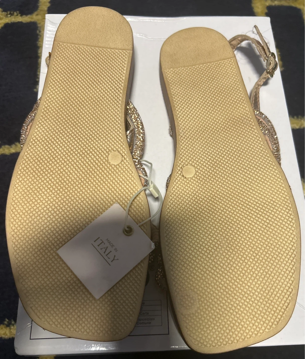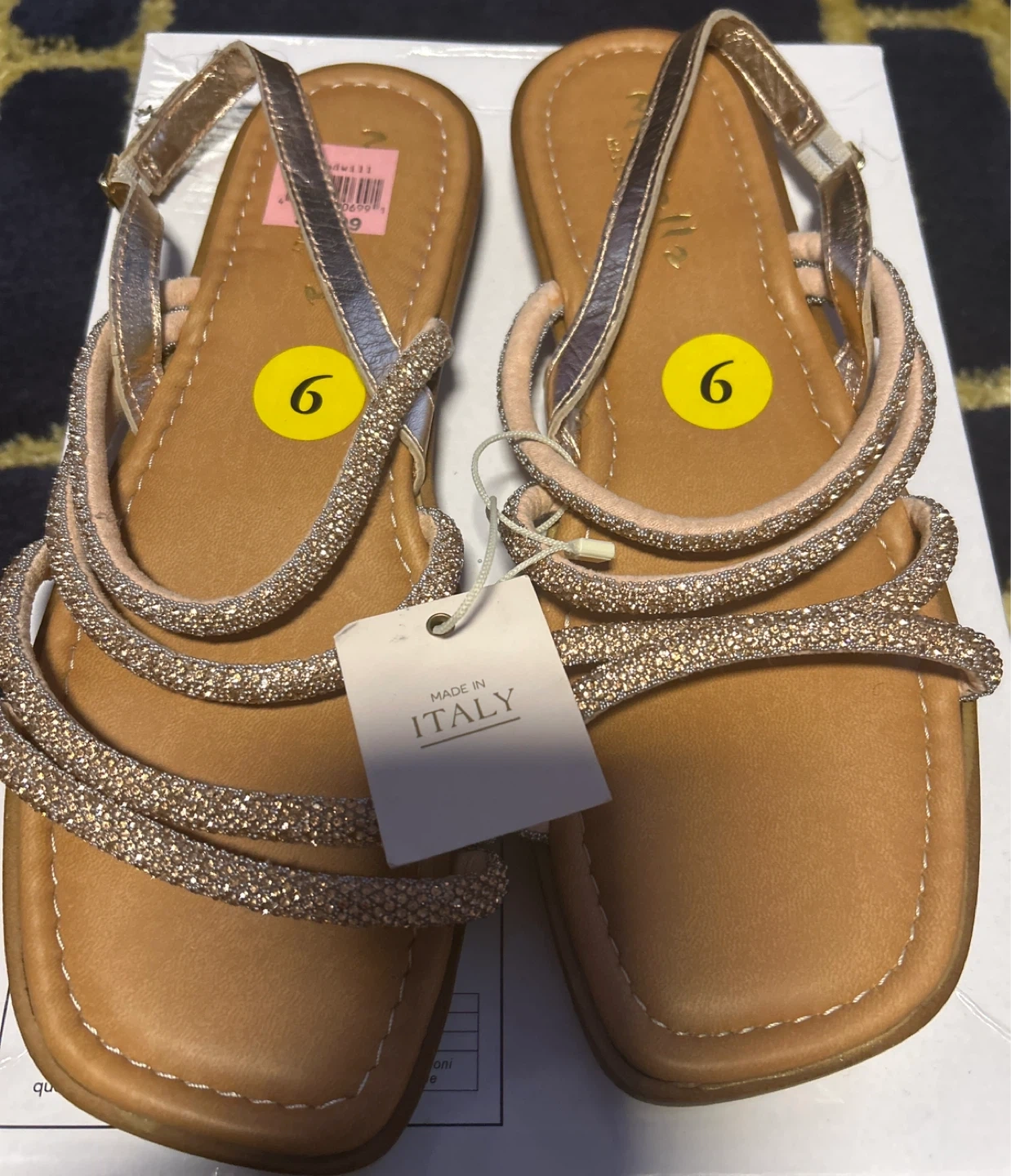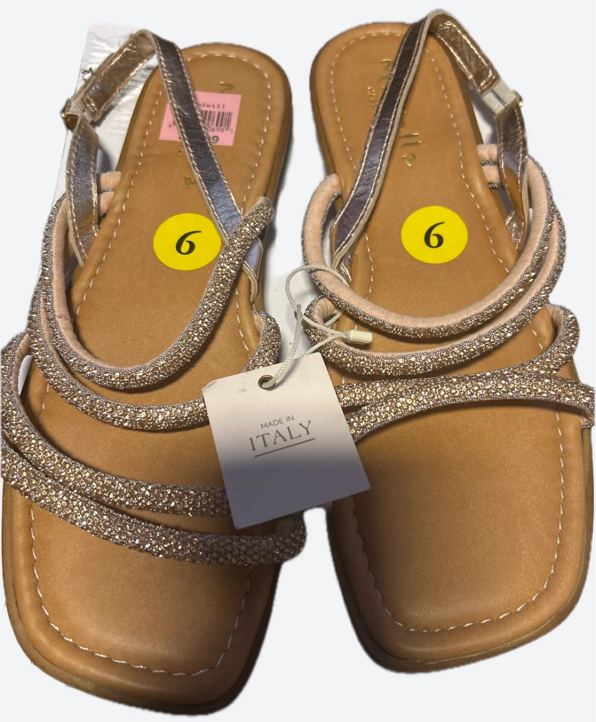 These sandals are made in Italy and are a size 9.They feature a sparkly strap design. They are in good condition and ready for a new owner!