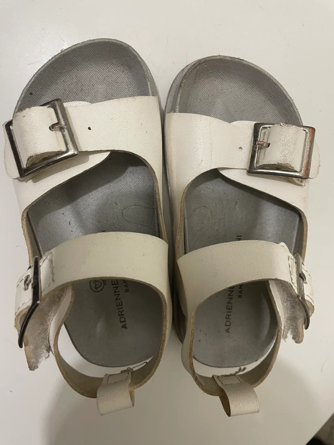 These are white sandals by Adrienne Vittadini. They feature adjustable buckle straps for a secure fit. The footbed is contoured for comfort.