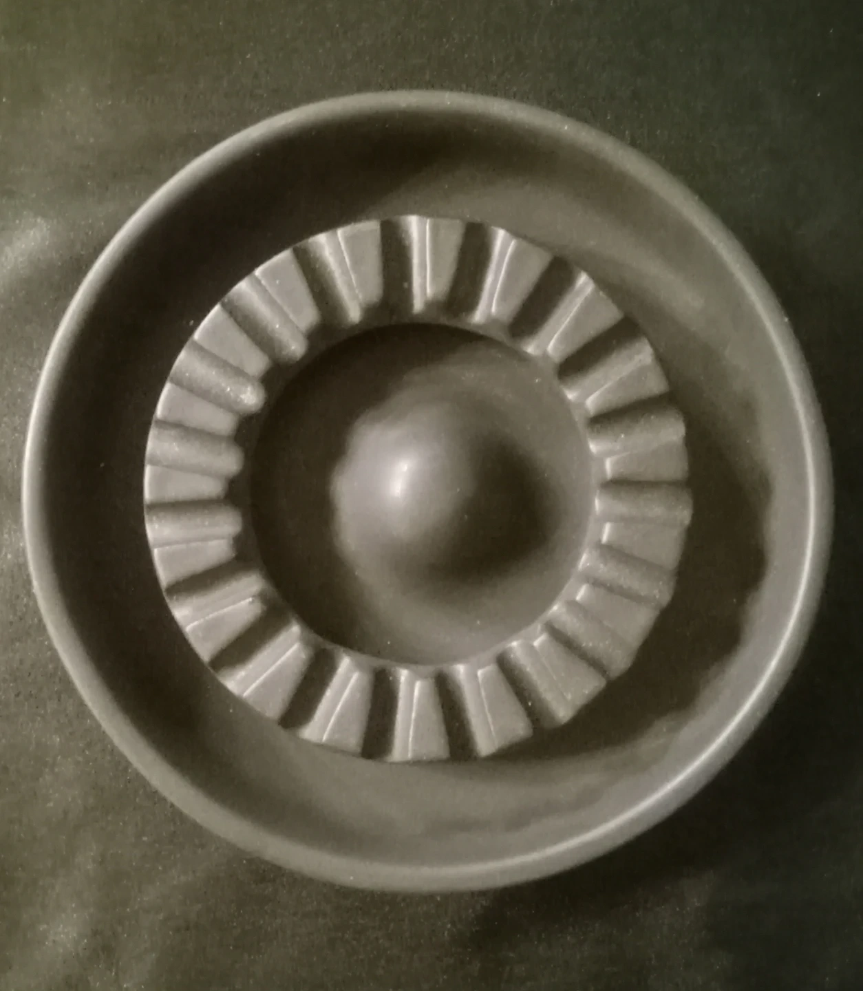 This is a vintage ashtray with a dark gray color. It's made of what appears to be a sturdy material, possibly ceramic or metal. The design features a ribbed edge around the center. It's a functional piece for any smoking area.