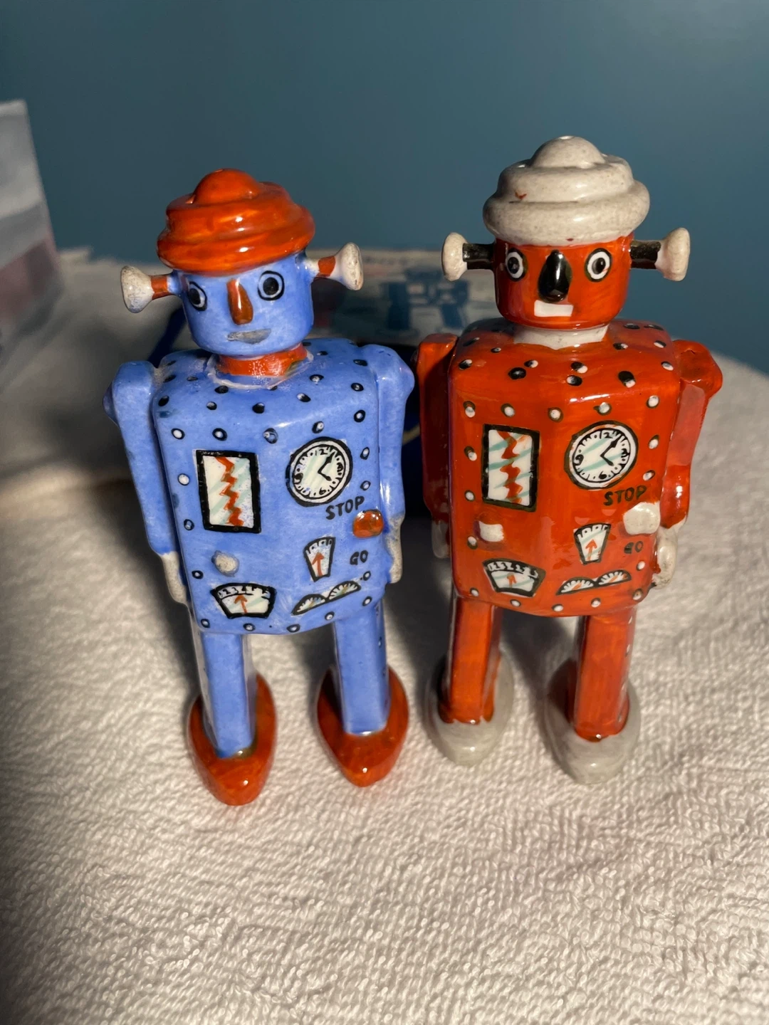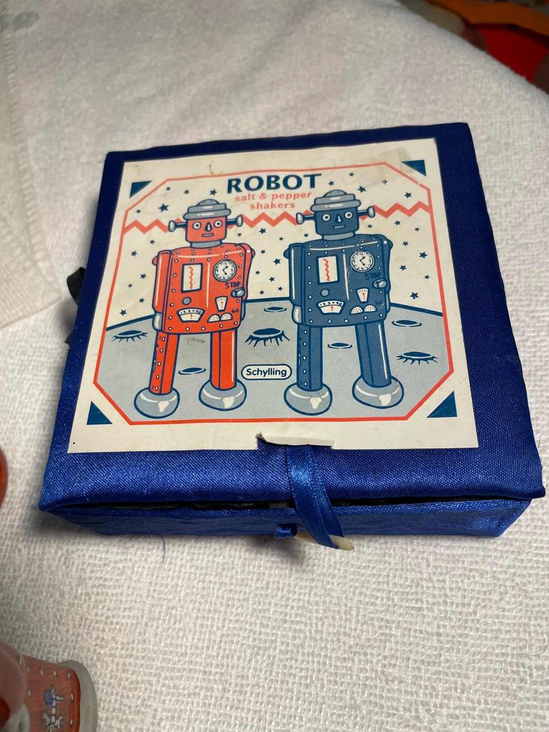 Selling a brand new set of vintage Schylling Robot Salt & Pepper Shakers! These adorable robot shakers come in their original box, ready to add a touch of retro fun to your kitchen or collection. One robot is red and the other is blue, both with charming details and a classic design.