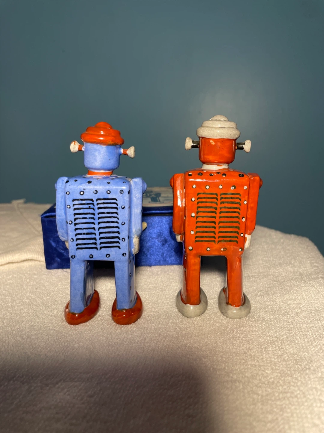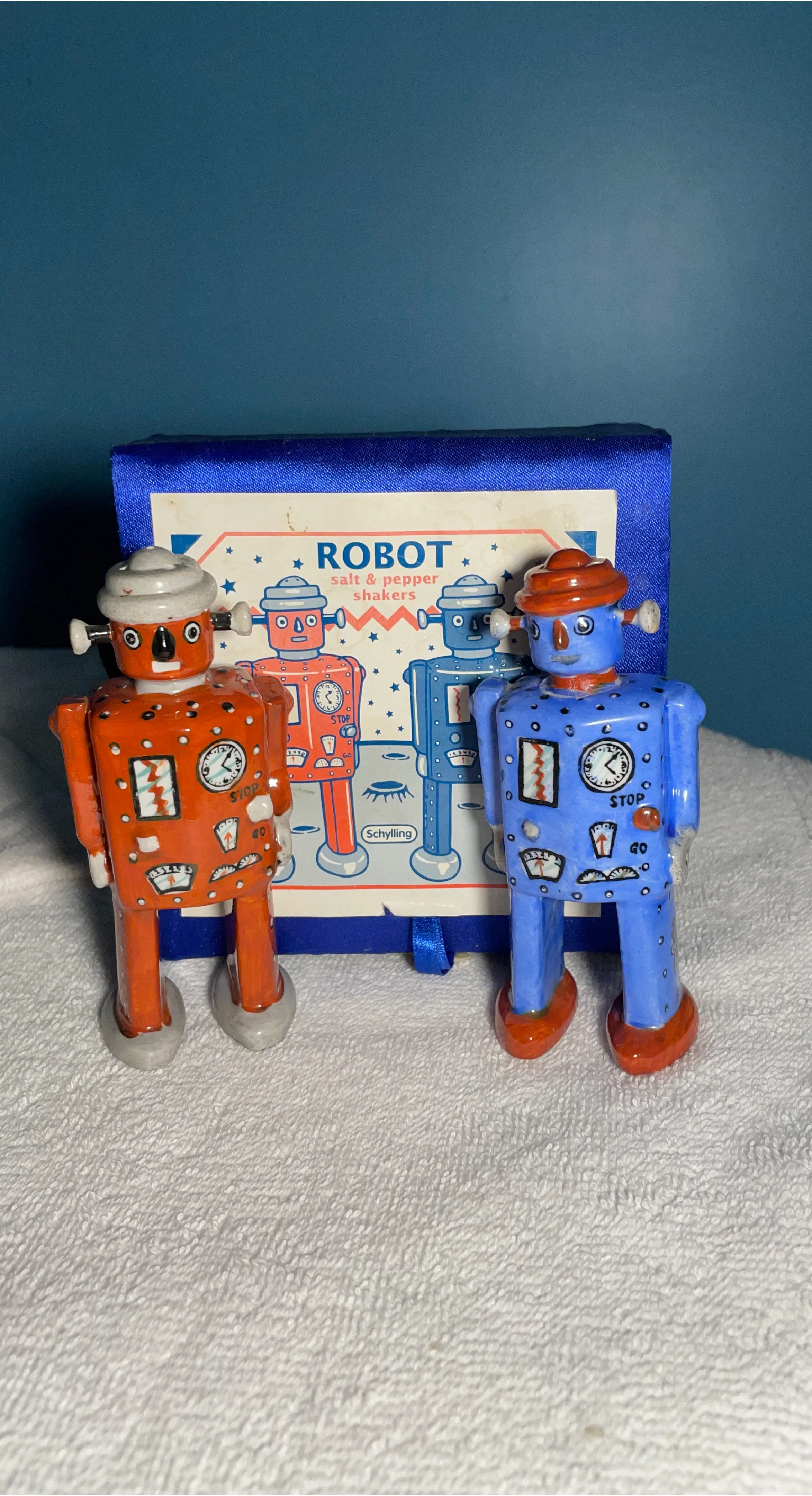 Selling a brand new set of vintage Schylling Robot Salt & Pepper Shakers! These adorable robot shakers come in their original box, ready to add a touch of retro fun to your kitchen or collection. One robot is red and the other is blue, both with charming details and a classic design.