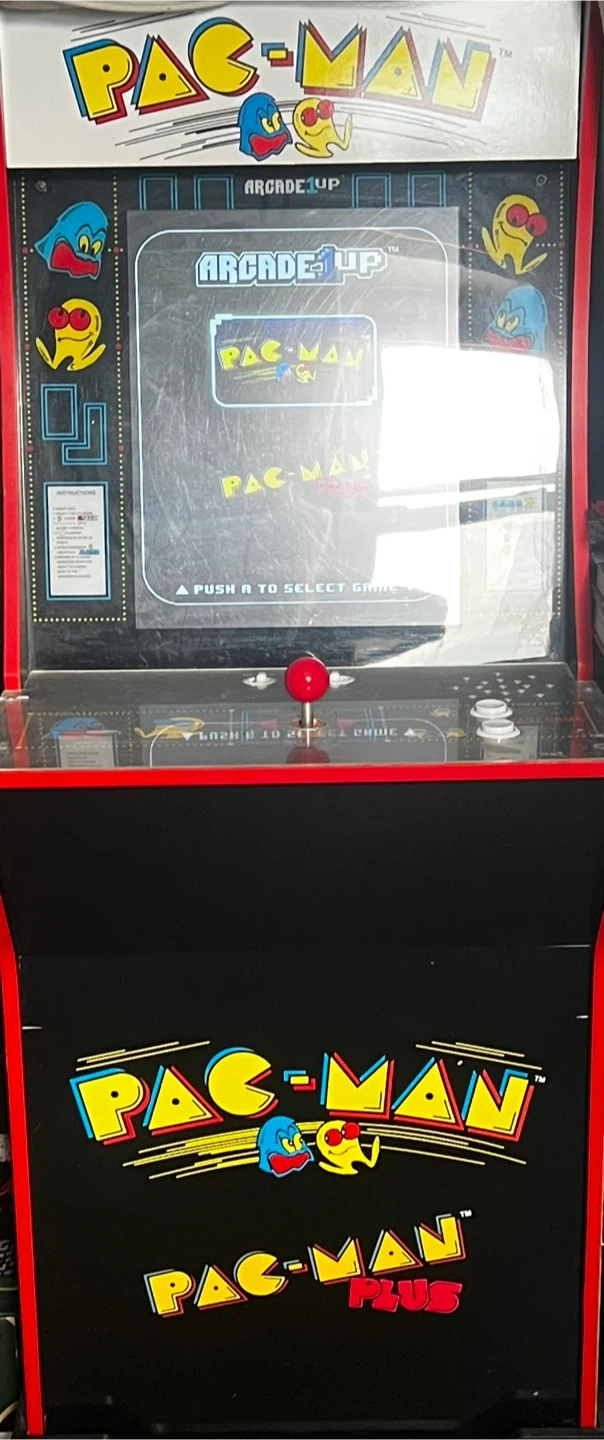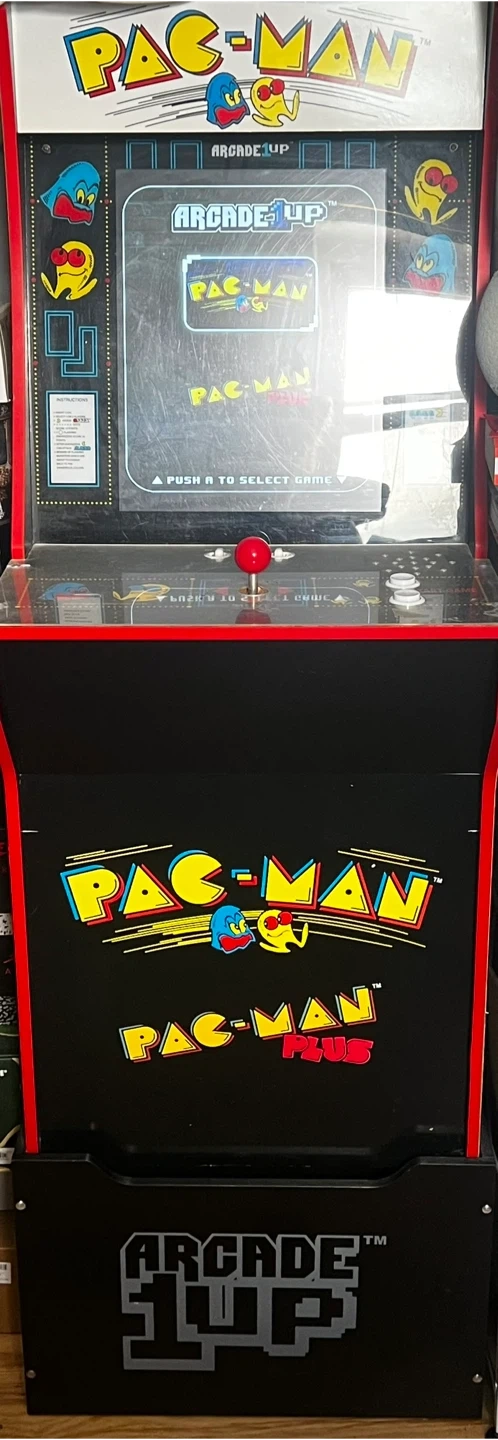 This is an Arcade1Up Pac-Man Plus arcade cabinet. It features classic Pac-Man and Pac-Man Plus games. It's great for game rooms or entertainment spaces