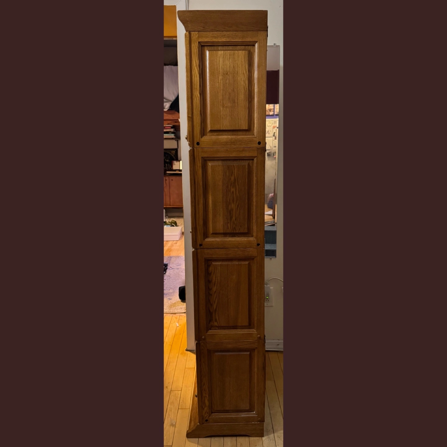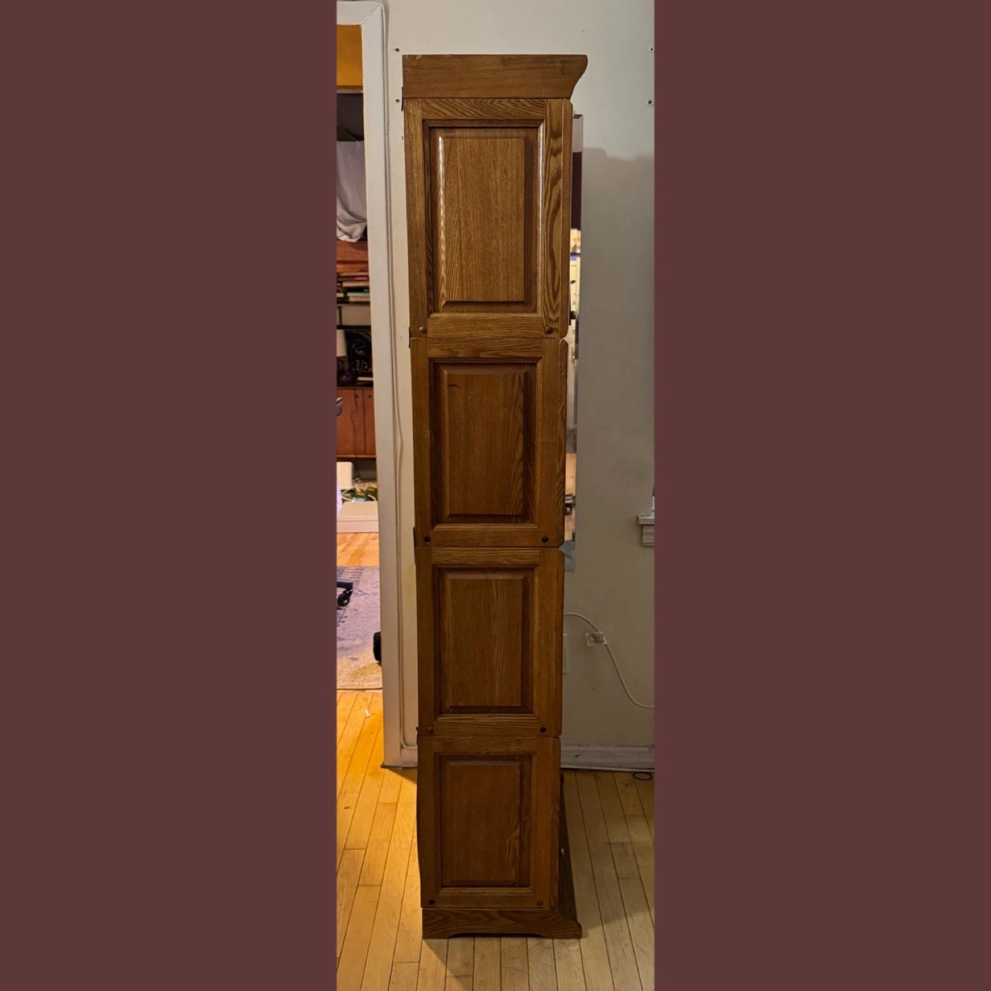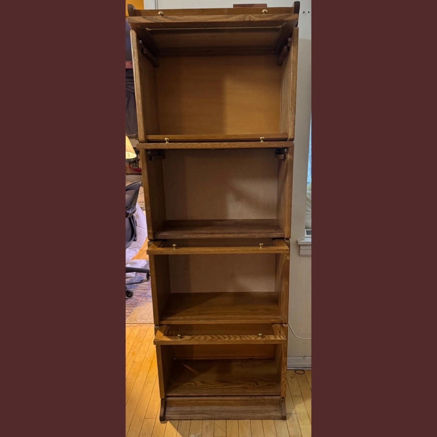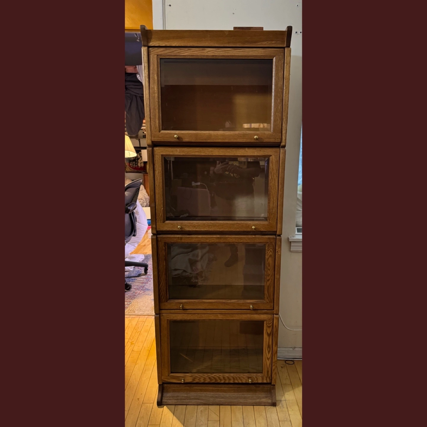 Vintage bookcase with a tall, thin design. Four stacked sections. Glass doors, wooden frames. A great place to store your books, bringing a sense of calm to your living space.