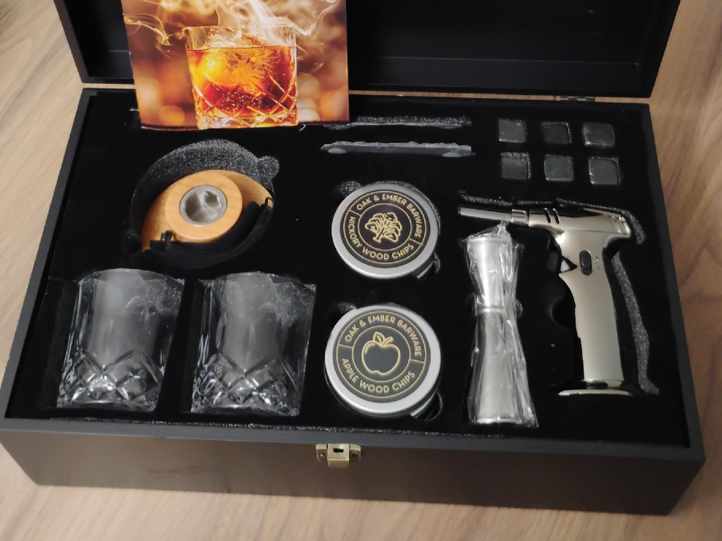 60Selling an Oak & Ember Barware smoking kit! This set comes with everything you need to infuse your drinks with delicious smoky flavors. It includes wood chips, a smoking gun, glasses, and other bar tools. The set is in excellent condition and comes in its original box.