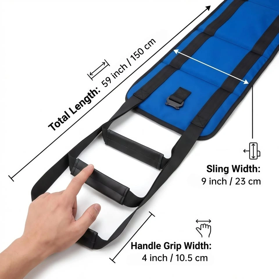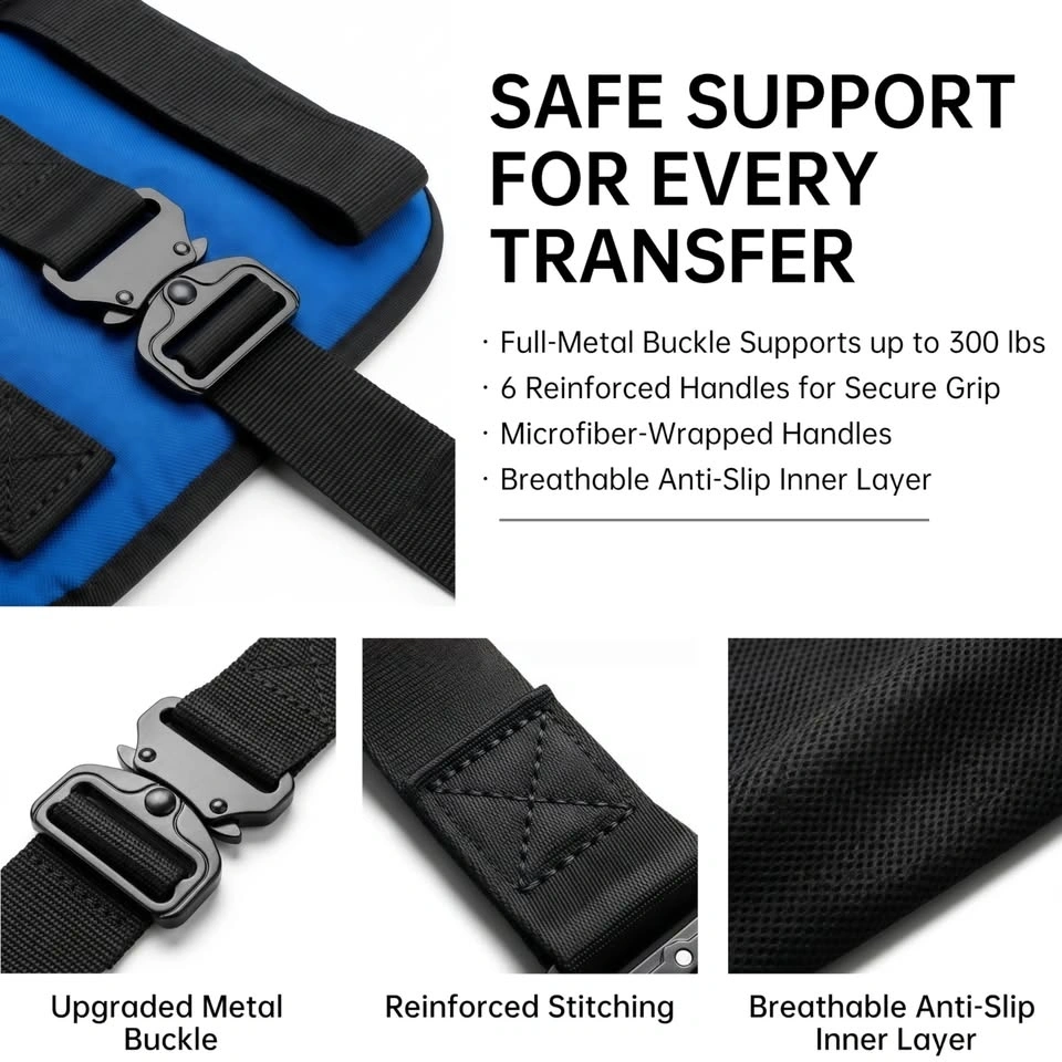 Handy patient transfer sling. Blue and black. Super sturdy with a full metal buckle, can support up to 300 lbs. Got 6 reinforced handles for a good grip, and they're microfiber-wrapped too. Plus, it has a breathable anti-slip inner layer. Measures 59 inches long and 9 inches wide. Good for safe transfers!