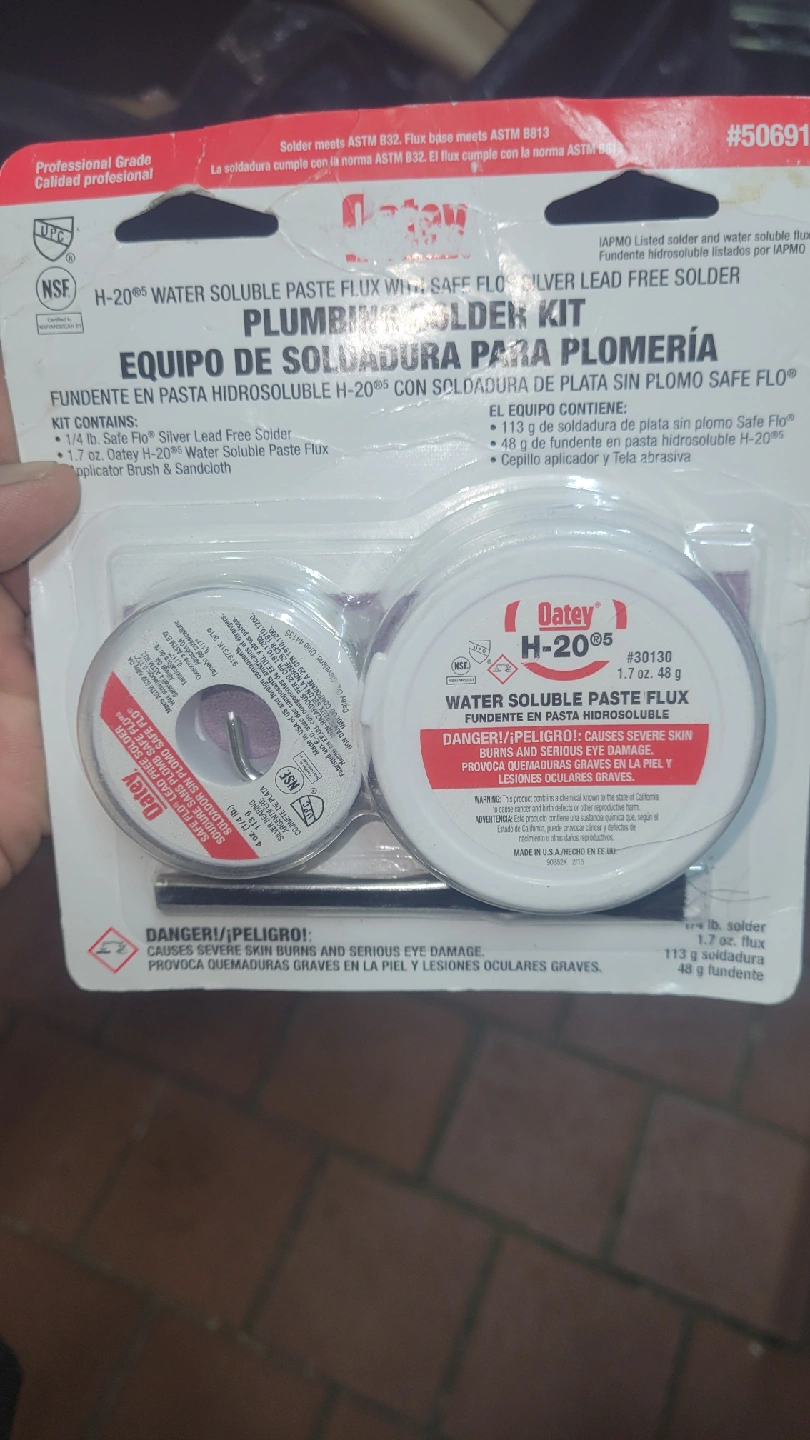 Selling an Oatey H-20 Water Soluble Paste Flux Plumbing Solder Kit. It includes: - 1/4 lb Safe Flo Silver Lead Free Solder - 1.7 oz Oatey H-20 Water Soluble Paste Flux - Applicator Brush & Sandcloth