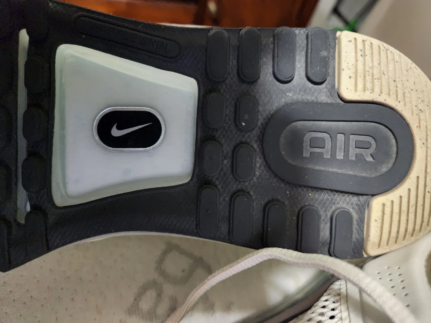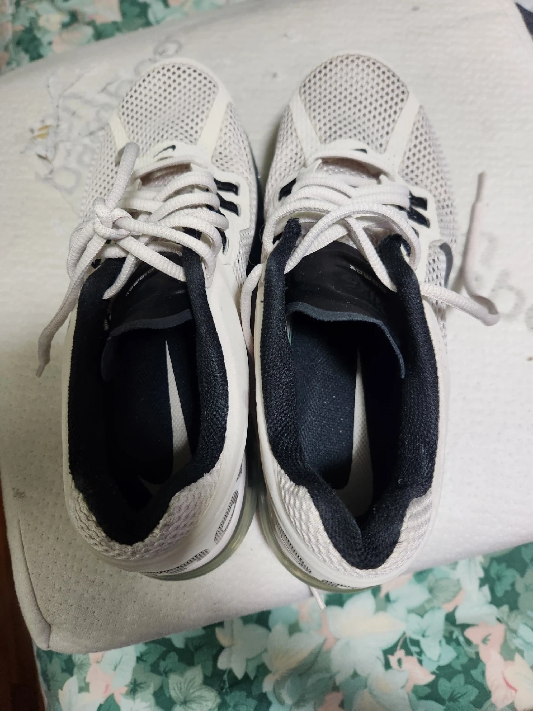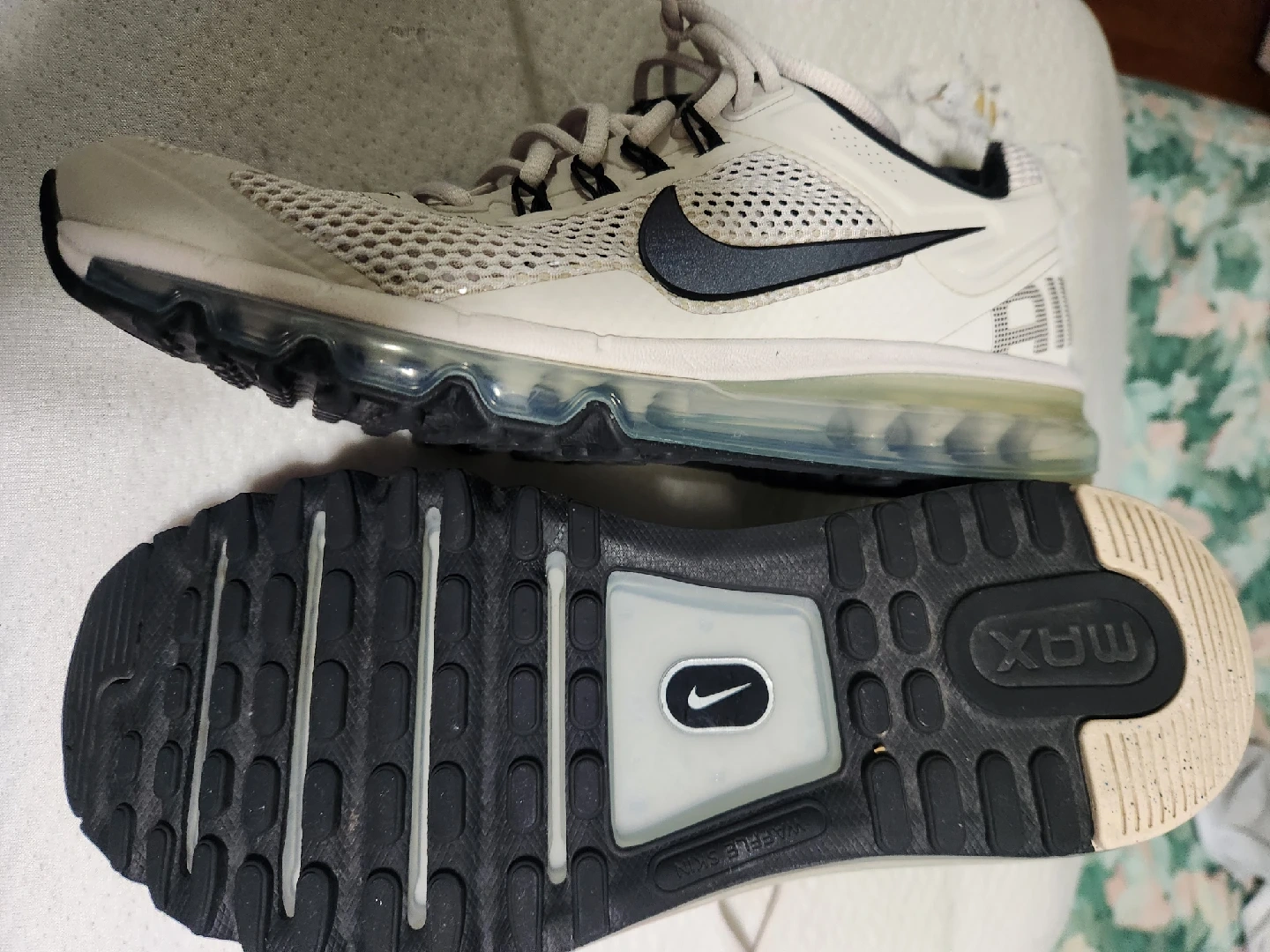 Selling a pair of Nike Air Max shoes. They are white with black accents and the word 'AIR' on the heel. The soles have the Nike logo and the word 'MAX'.