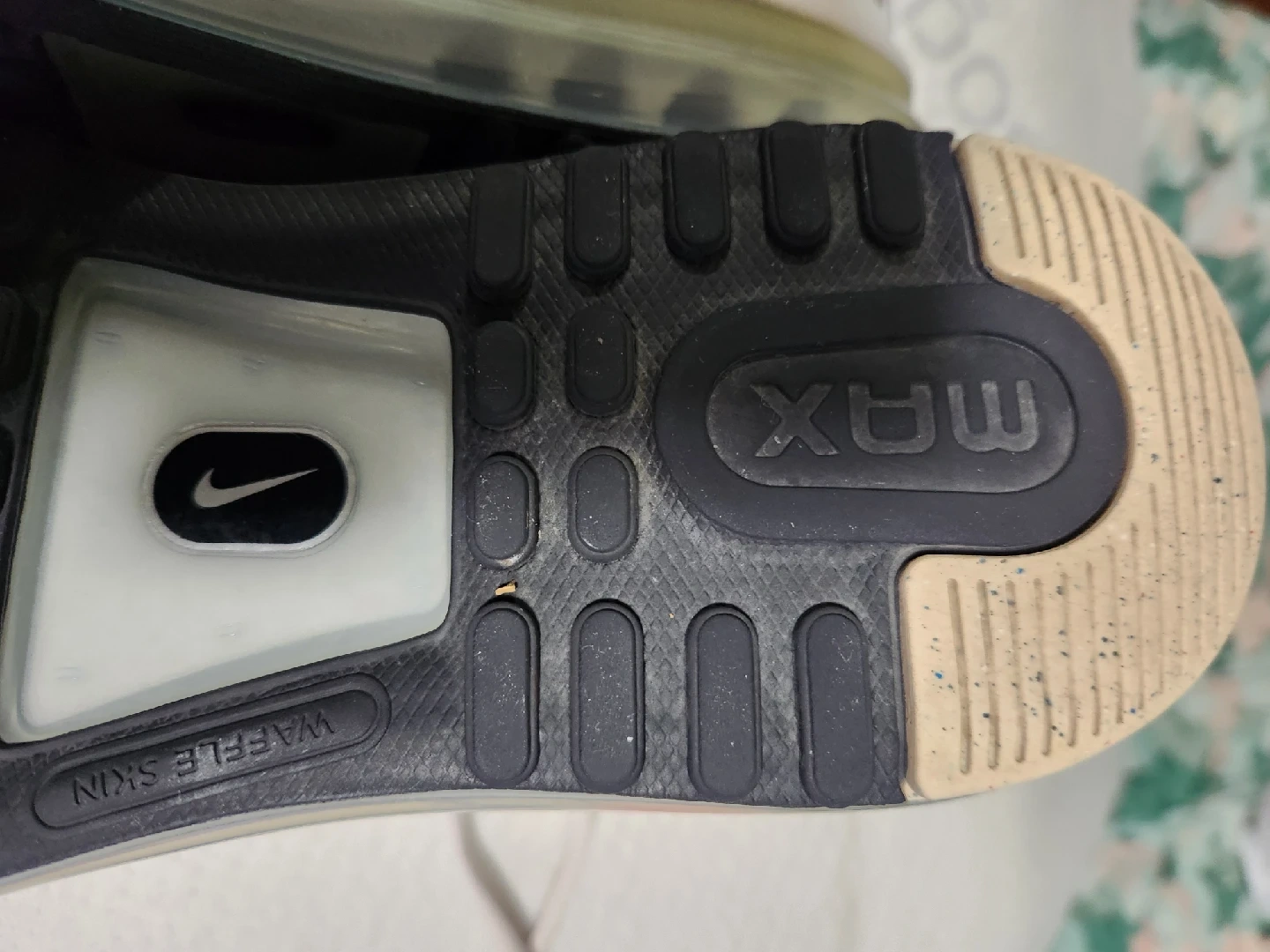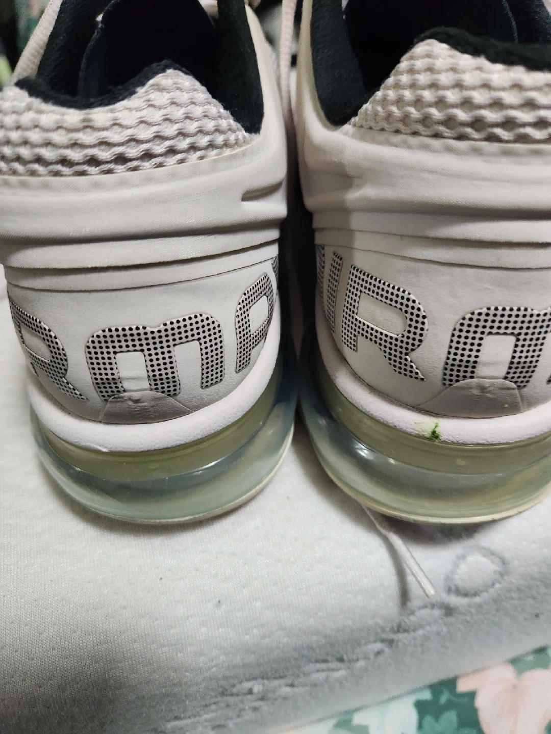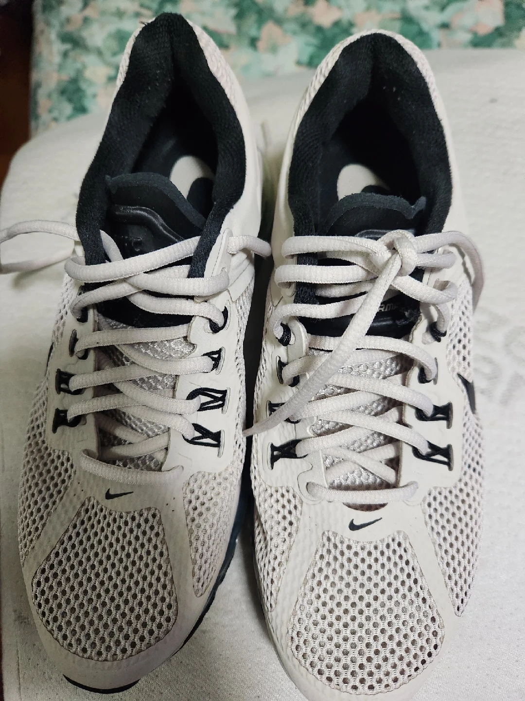 Selling a pair of Nike Air Max shoes. They are white with black accents and the word 'AIR' on the heel. The soles have the Nike logo and the word 'MAX'.