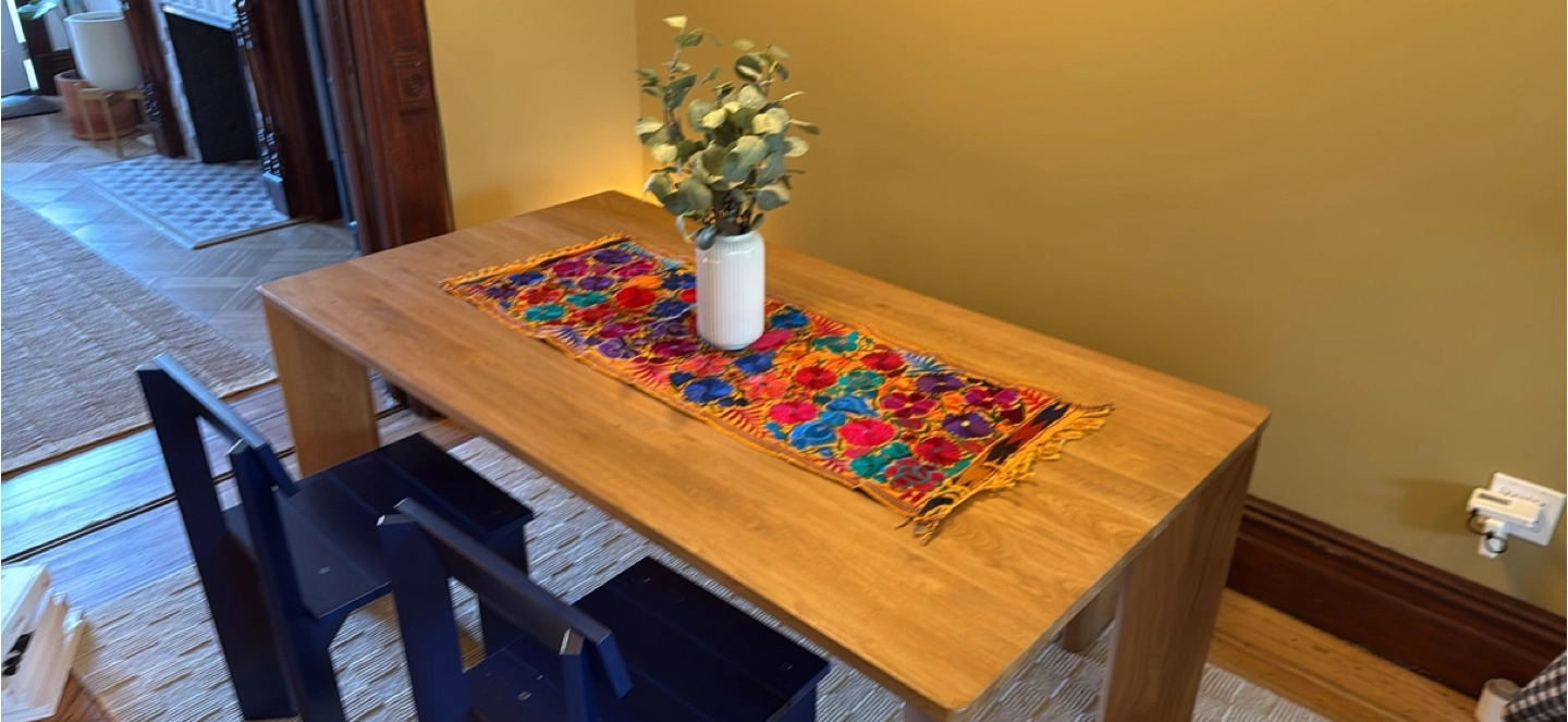 112Add a pop of color to your dining or coffee table with this vibrant embroidered table runner! The intricate floral design features a mix of reds, purples, oranges, and blues on a sunny yellow background. It's perfect for adding a touch of bohemian style to any room