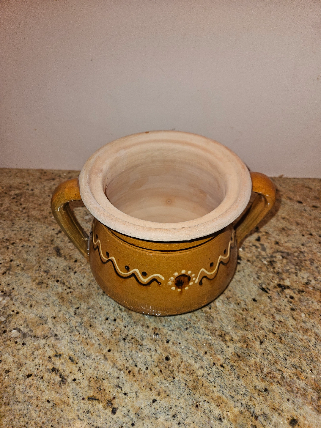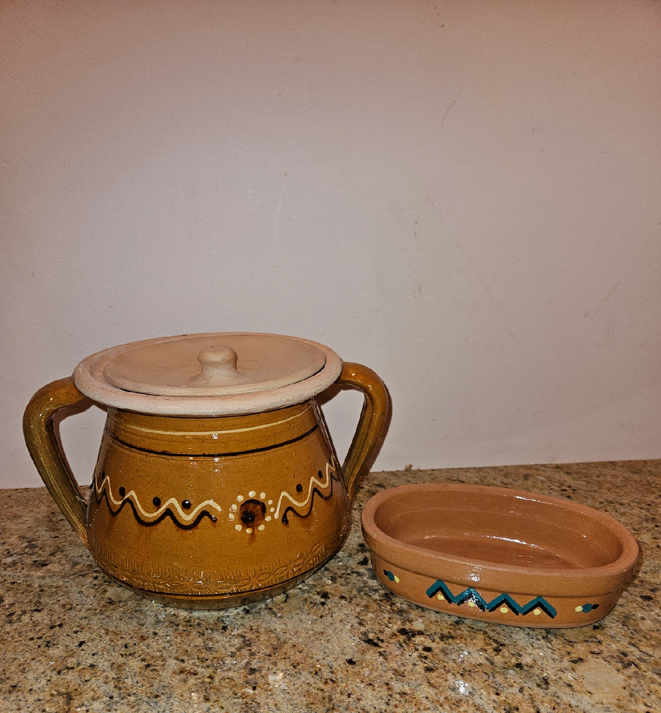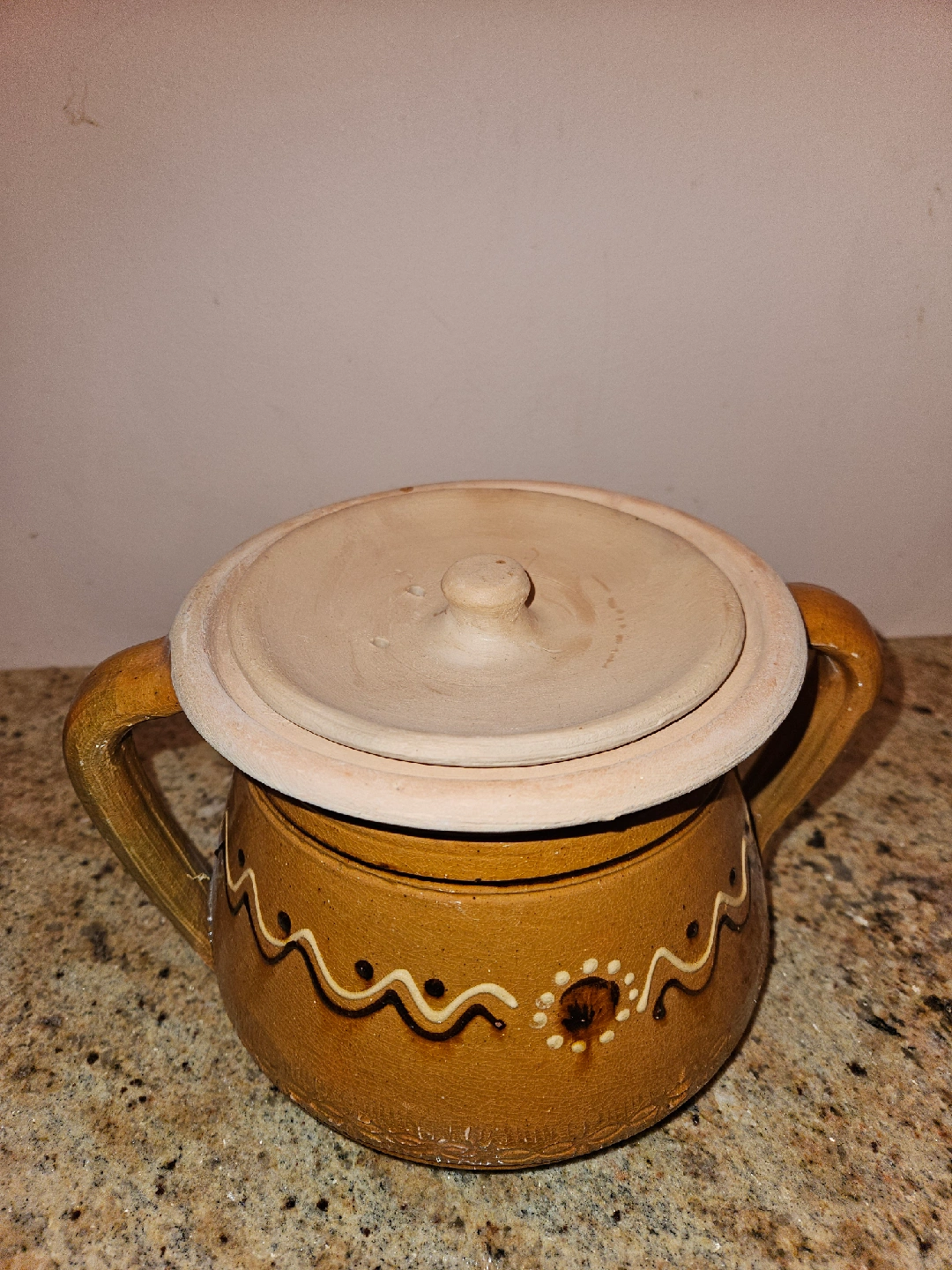 Selling a vintage ceramic pot with a lid. It has a unique design, perfect for adding a rustic touch to your kitchen or decor. The pot is in good condition and ready for a new home!