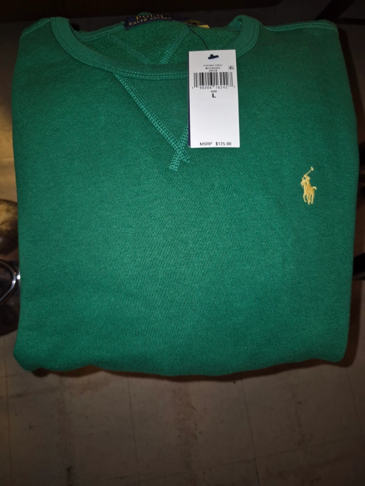 I'm selling a Polo Ralph Lauren sweatshirt in a vibrant green color. The size is large. It has the classic Polo logo embroidered on the chest. The tag shows an original price of $125. It’s in great condition!