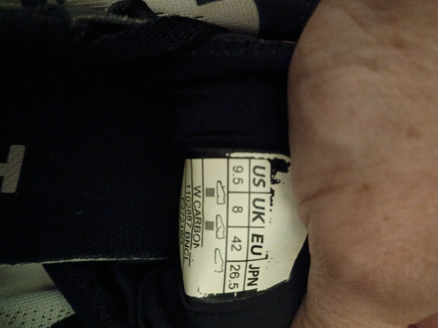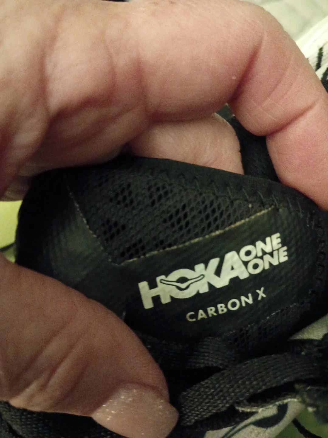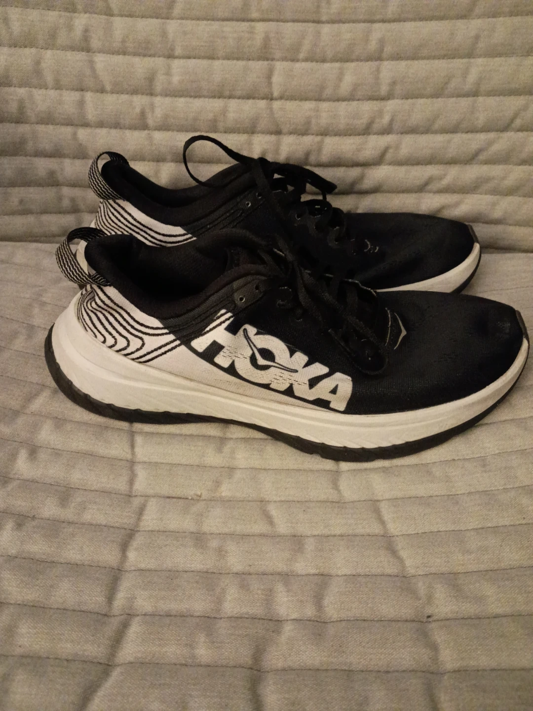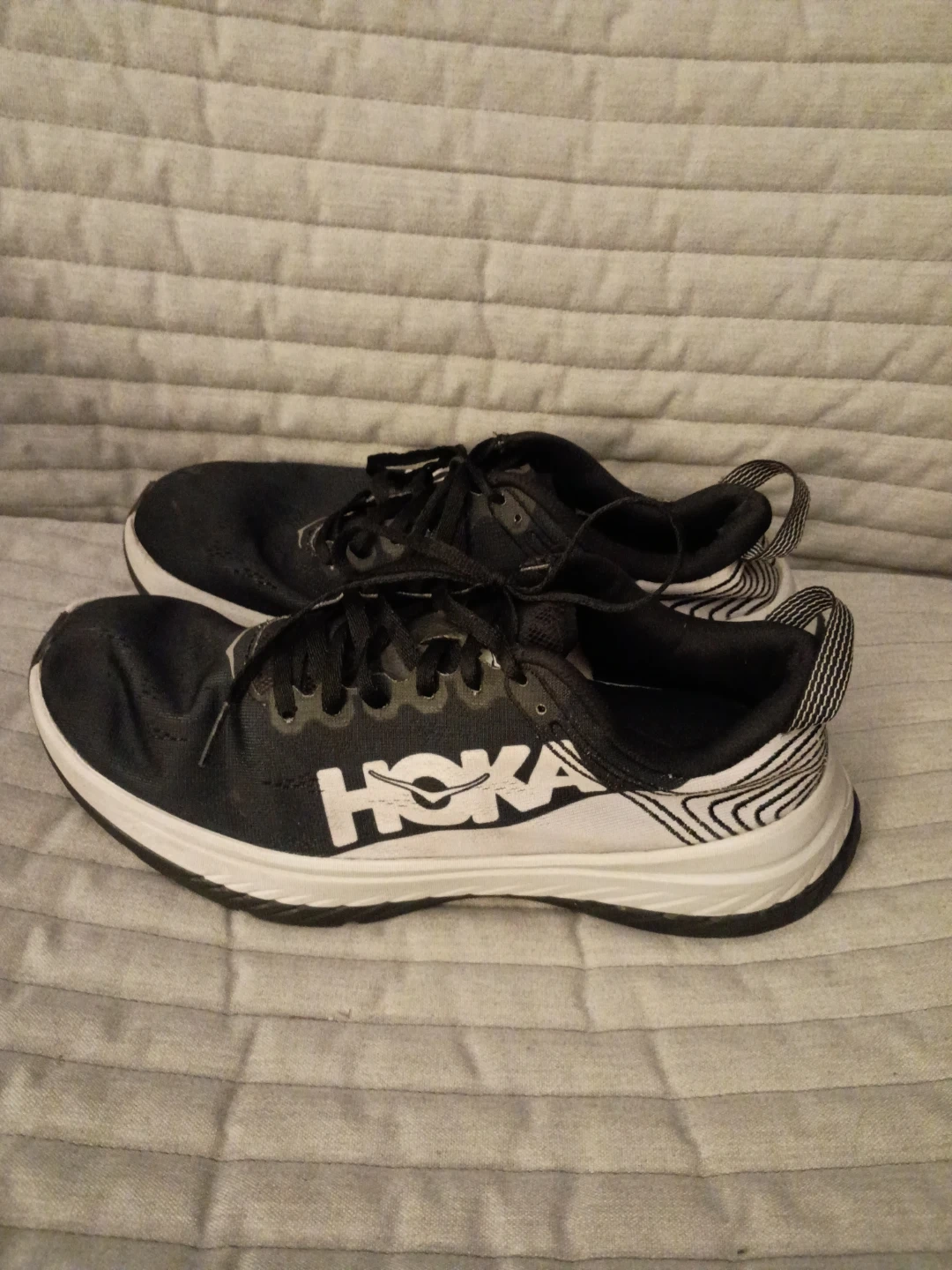 Selling a pair of Hoka Carbon X women's running shoes. They are black and white and in used condition. The size is US 9.5