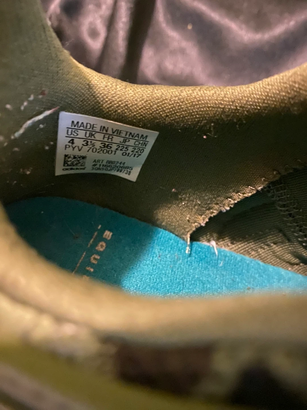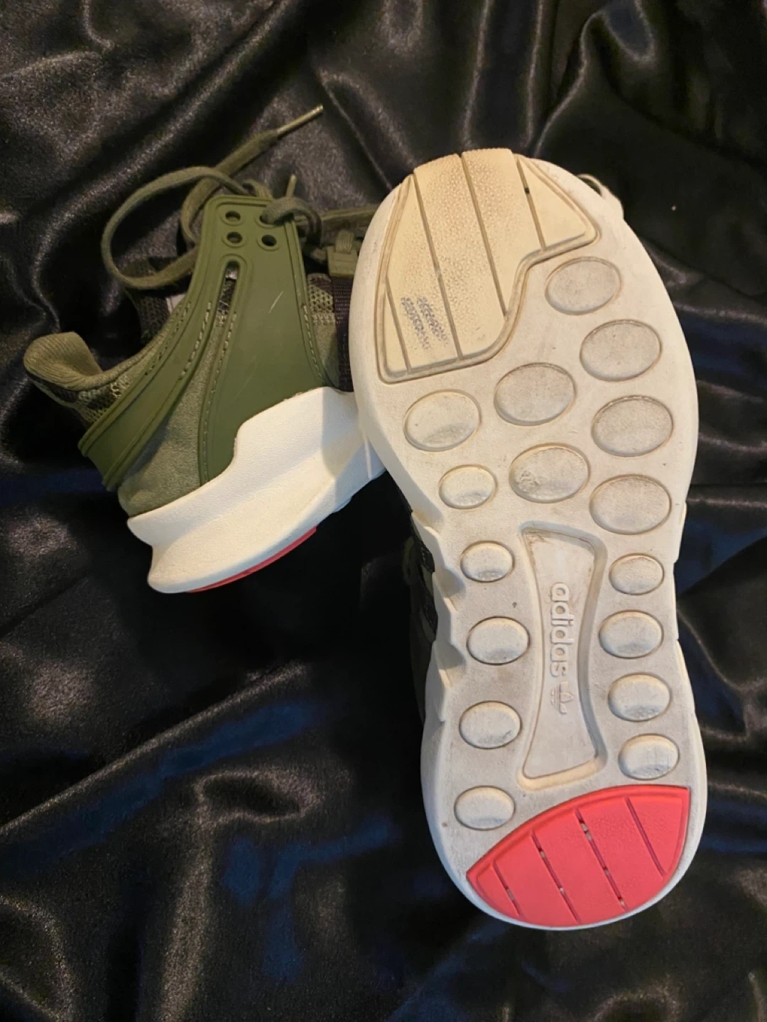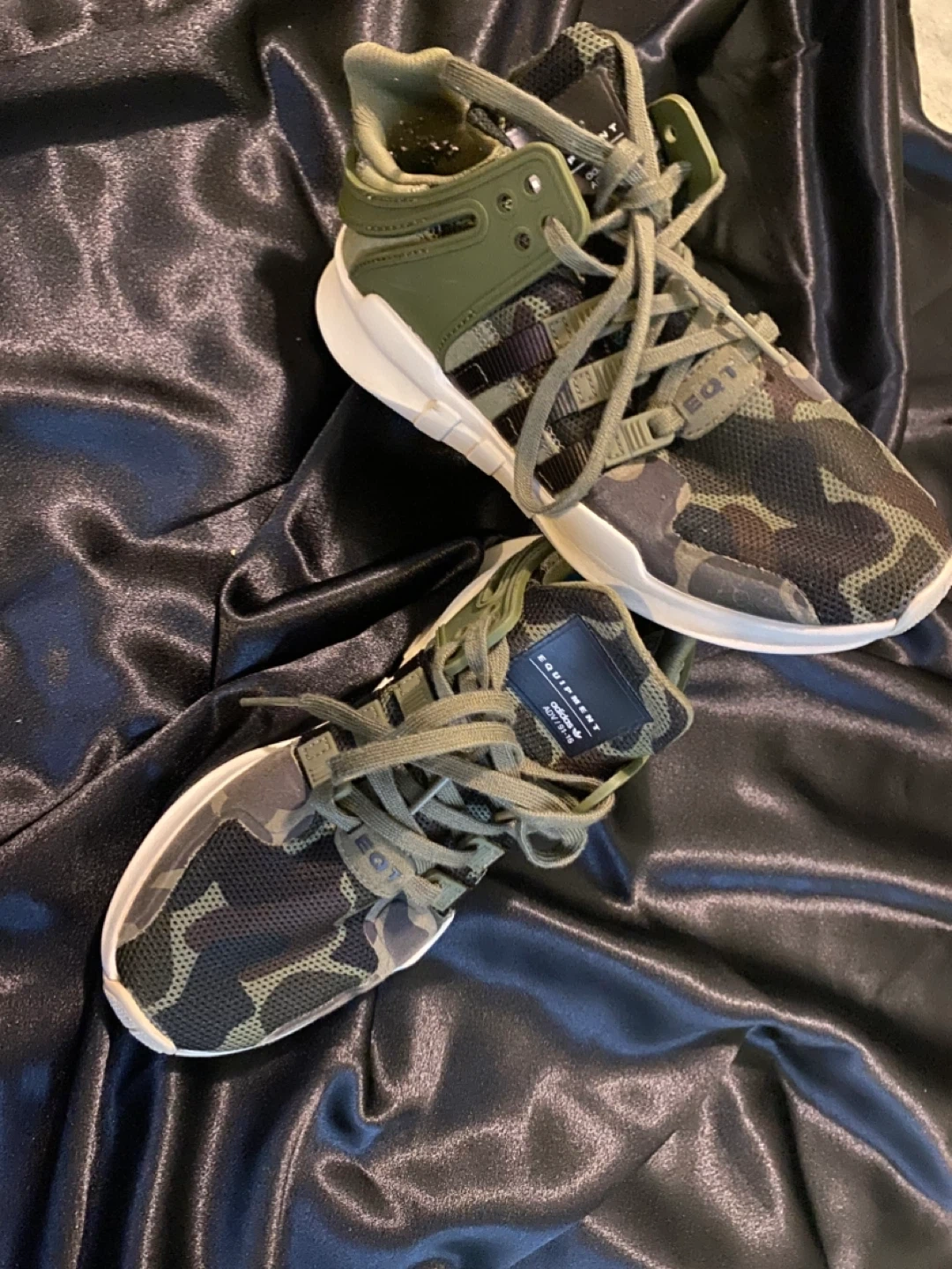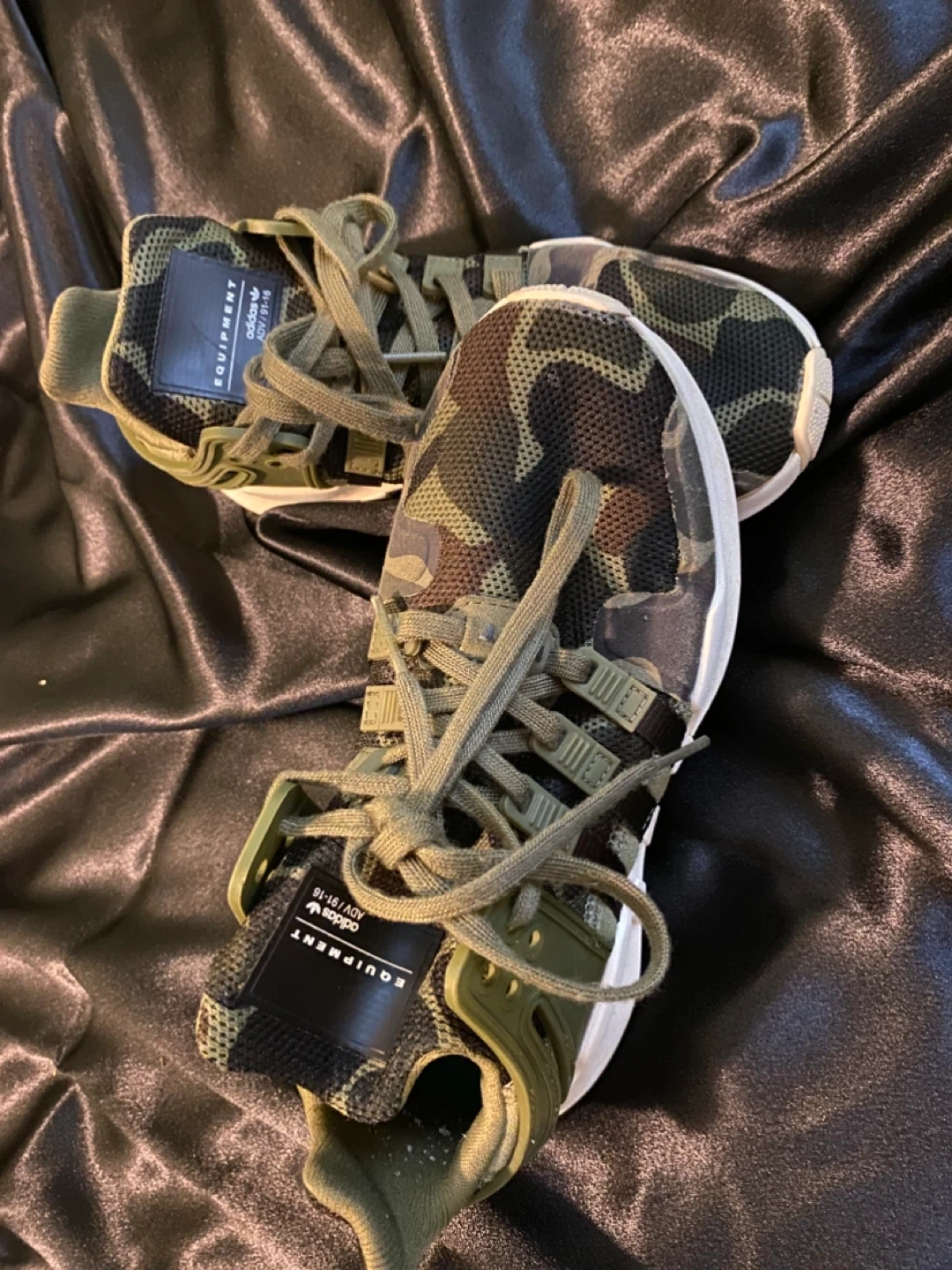 These Adidas EQT Support ADV sneakers come in a cool camouflage pattern. They are made in Vietnam and feature a durable rubber sole. Size is US 4, UK 3.5, EU 36, JP 225.