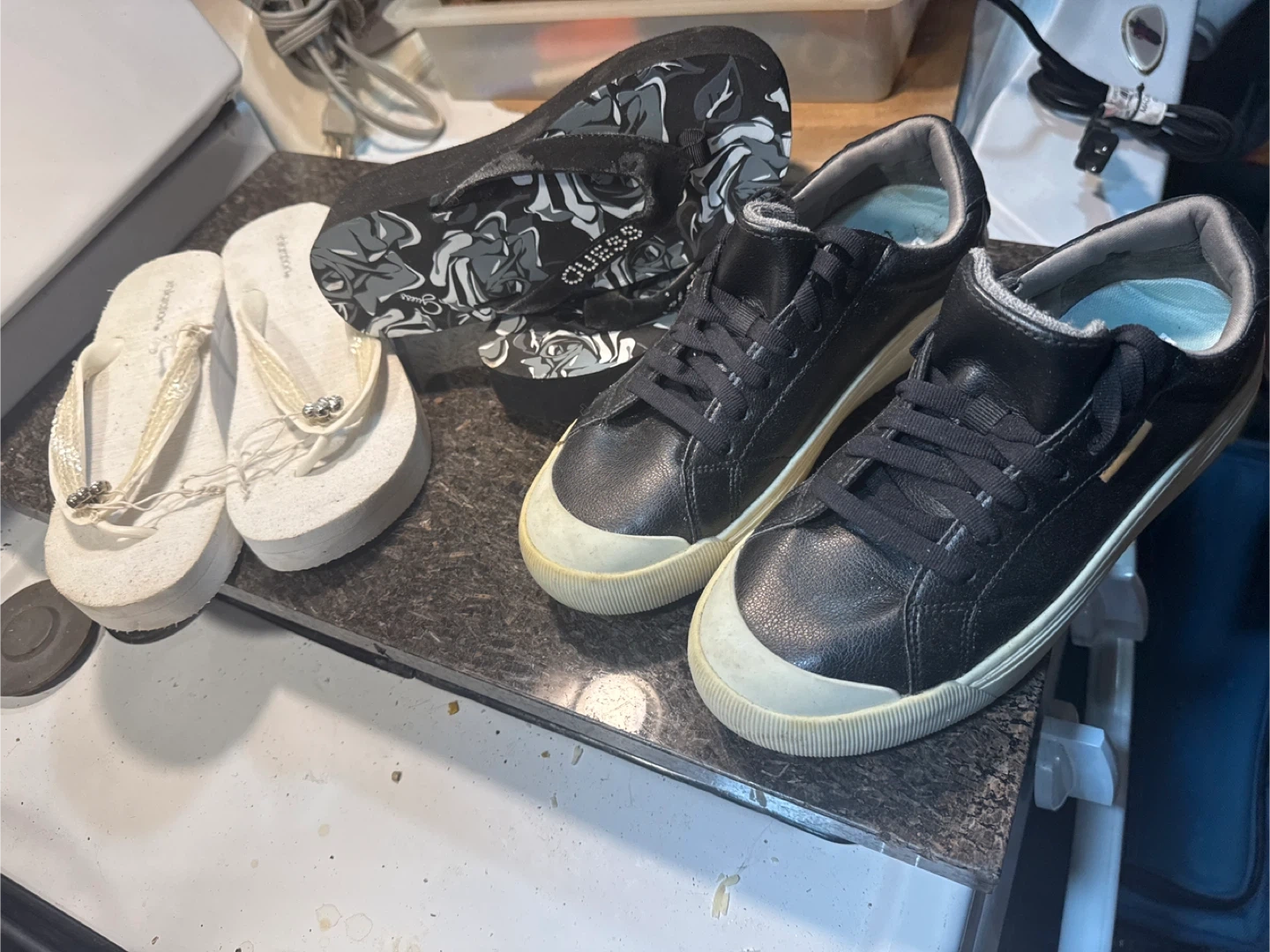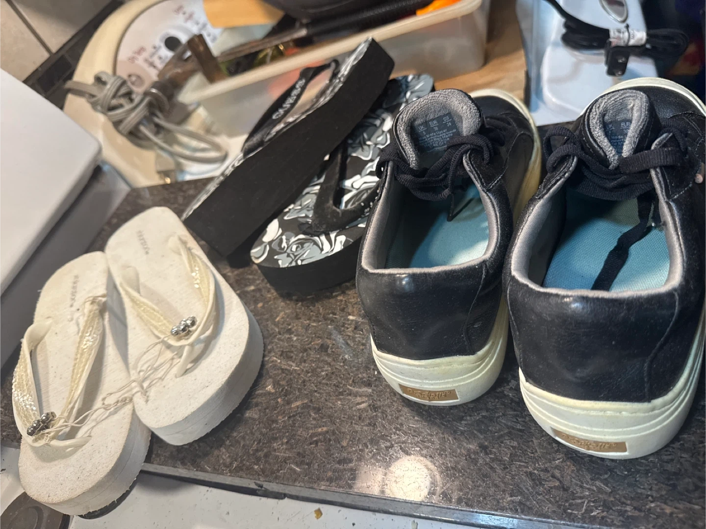 A pair of Dr. Schills sneakers with lace-up closure. That give supporting all the right places for an easy comfortable fit, and seal comes with two different pairs of flip-flops ones. One pair is of guess brand w/ flower print .(2nd) pair exhilaration and are white w/ jeweled flower accent . They're all in good condition! Sold together for $6