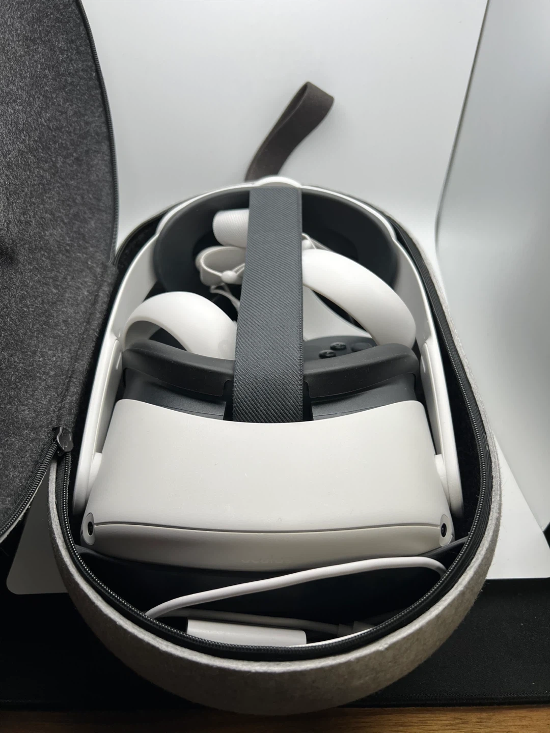 Oculus (Meta) Quest 2 VR Headset with Elite Strap And Lightweight Case. Storage: 256 GB Condition: Working like new. Hours used: Less than 300 hrs. Usage: Mainly for design and light use on gaming. Accessories: Oculus’s Elite Strap, Oculus’s Lightweight Case, Original charging cable, Original Head Strap, and Controllers with Fresh Batteries. Reason: Graduated and don’t need it anymore. *Very light stain on the case but they don’t smell.* *No Trade*