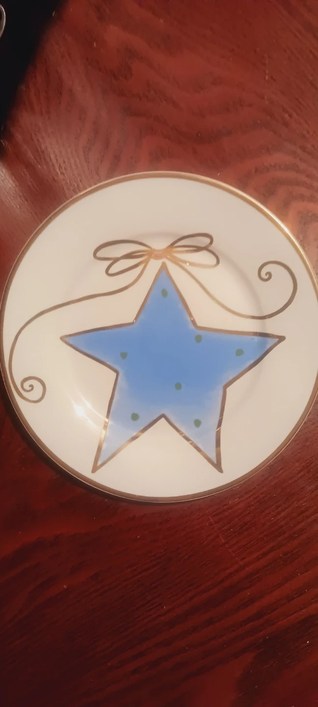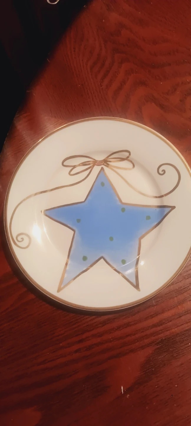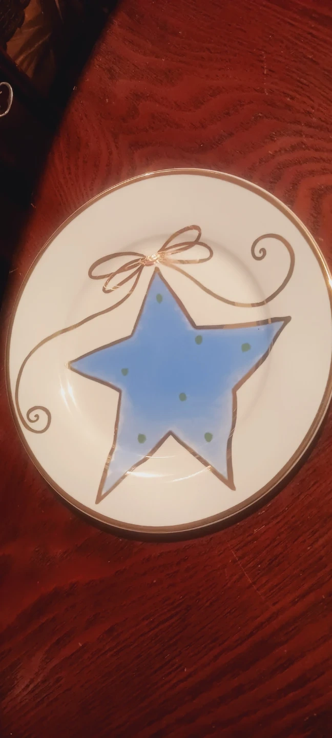 This is a decorative plate featuring a blue star with green polka dots, accented by a gold ribbon design. It has a gold rim around the edge. Plate measures 8 inches in diameter. It's made of ceramic material. This plate could be used for seasonal decor..New.