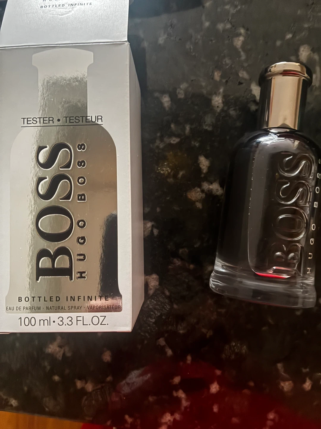 Hugo Boss Bottled Infinite Eau de Parfum tester for men. It's a natural spray vaporisateur. 100 ml (3.3 fl. oz.) bottle size. This fragrance is a tester size.1:1