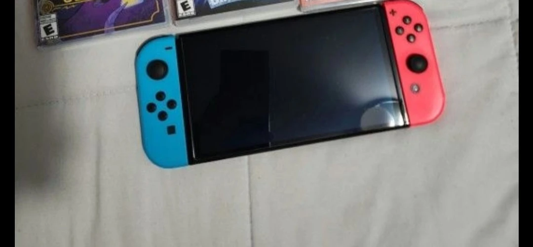 Nintendo Switch gaming console with detachable blue and red Joy-Con controllers. It's designed for both home and portable play. This system offers a versatile gaming experience.