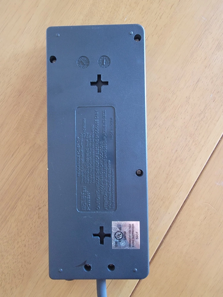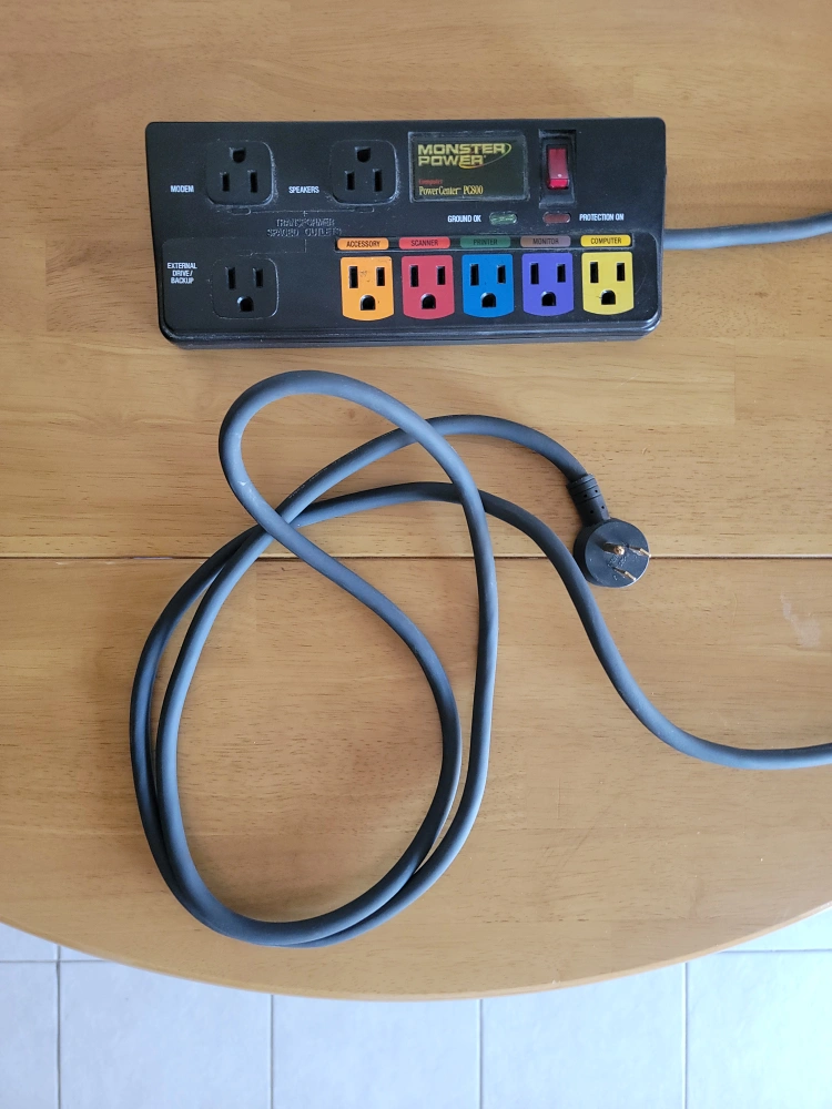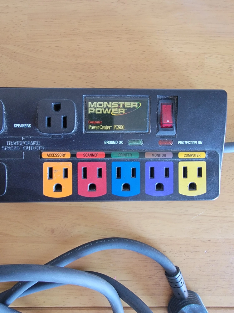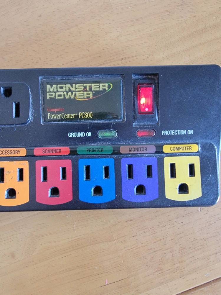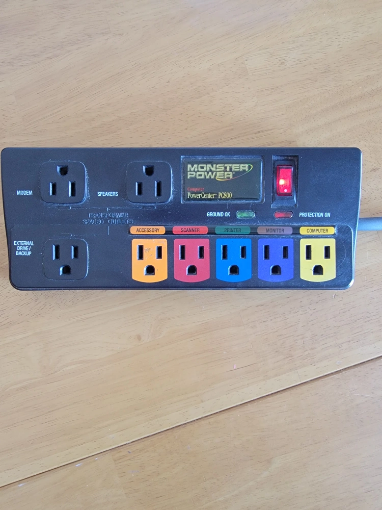 Monster Power PC800 surge protector with 8 outlets. It has dedicated outlets for modem, speakers, accessory, scanner, printer, monitor, and computer. Includes surge protection and ground ok indicators.