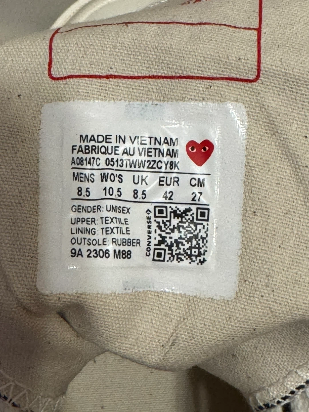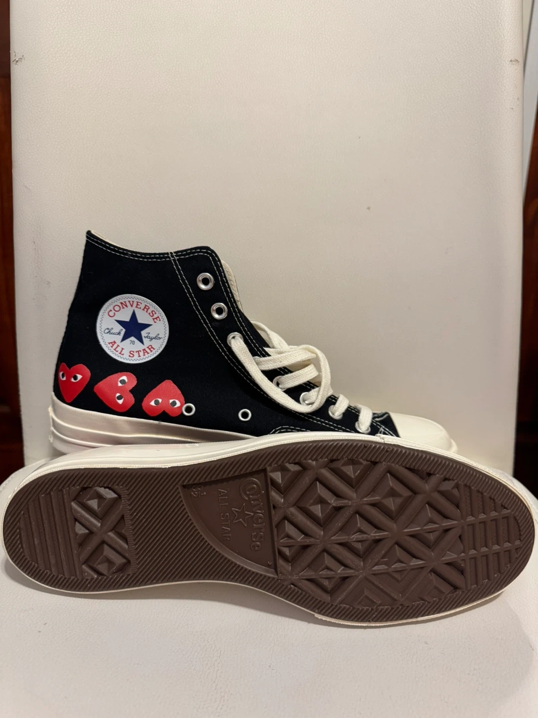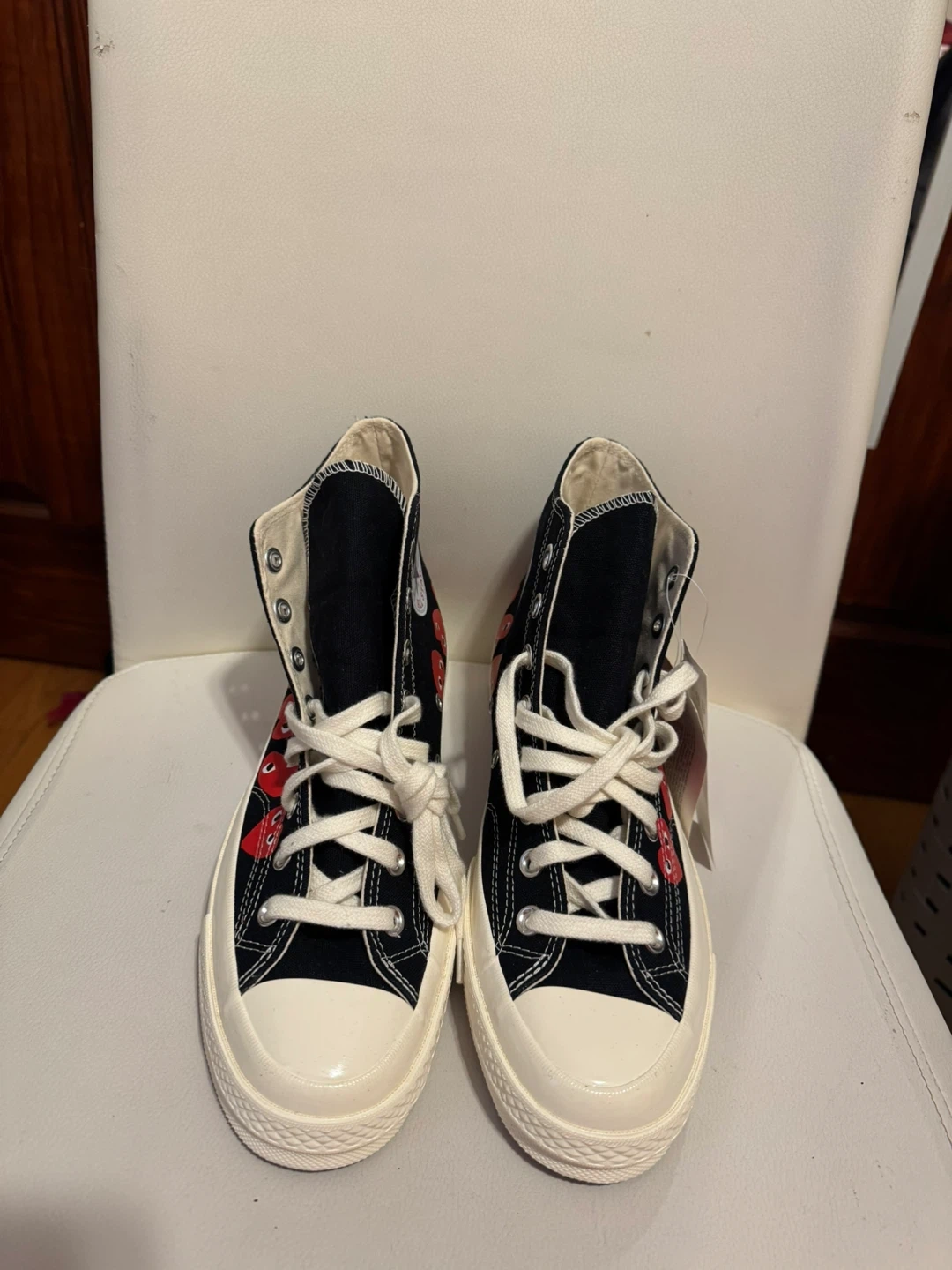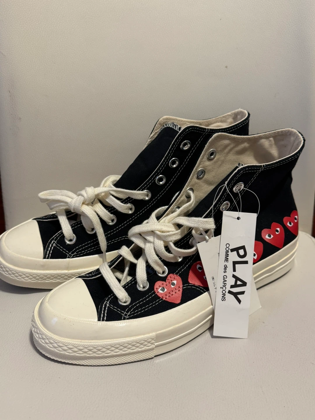 The Converse Chuck Taylor Comme des Garçons PLAY Black Multi-Heart High Top Sneakers in men's size 8.5. Brand new, no box, never worn.