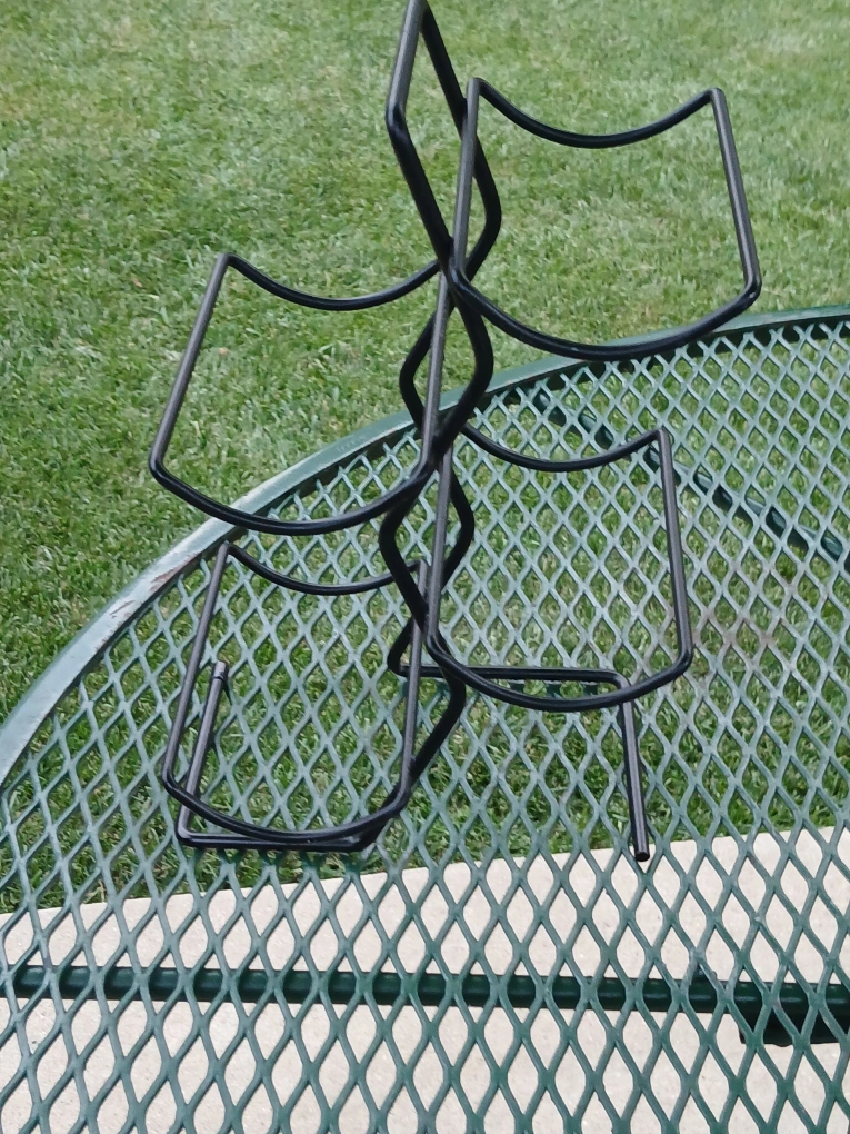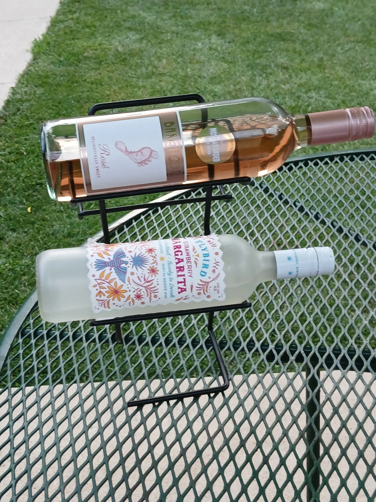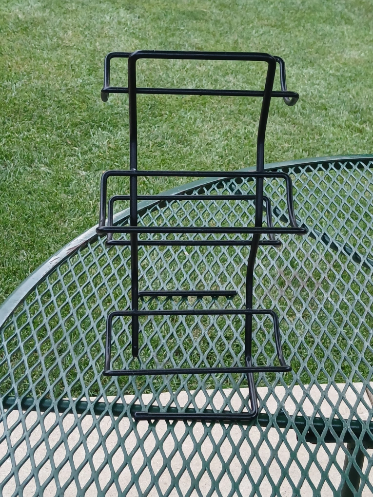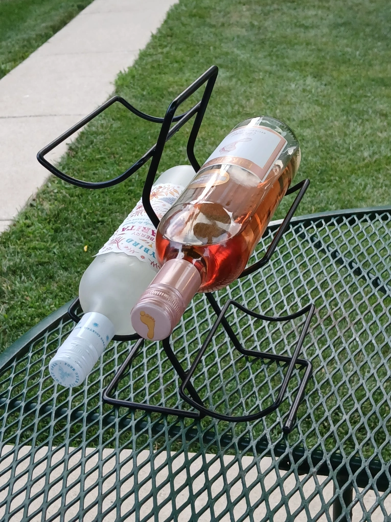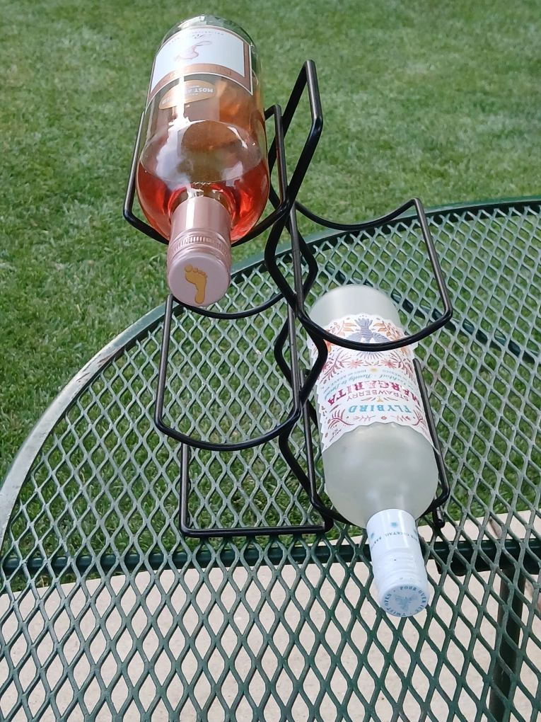 Here's a sturdy black metal wine rack that holds up to four bottles. It's in great condition and ready to display your favorite wines!