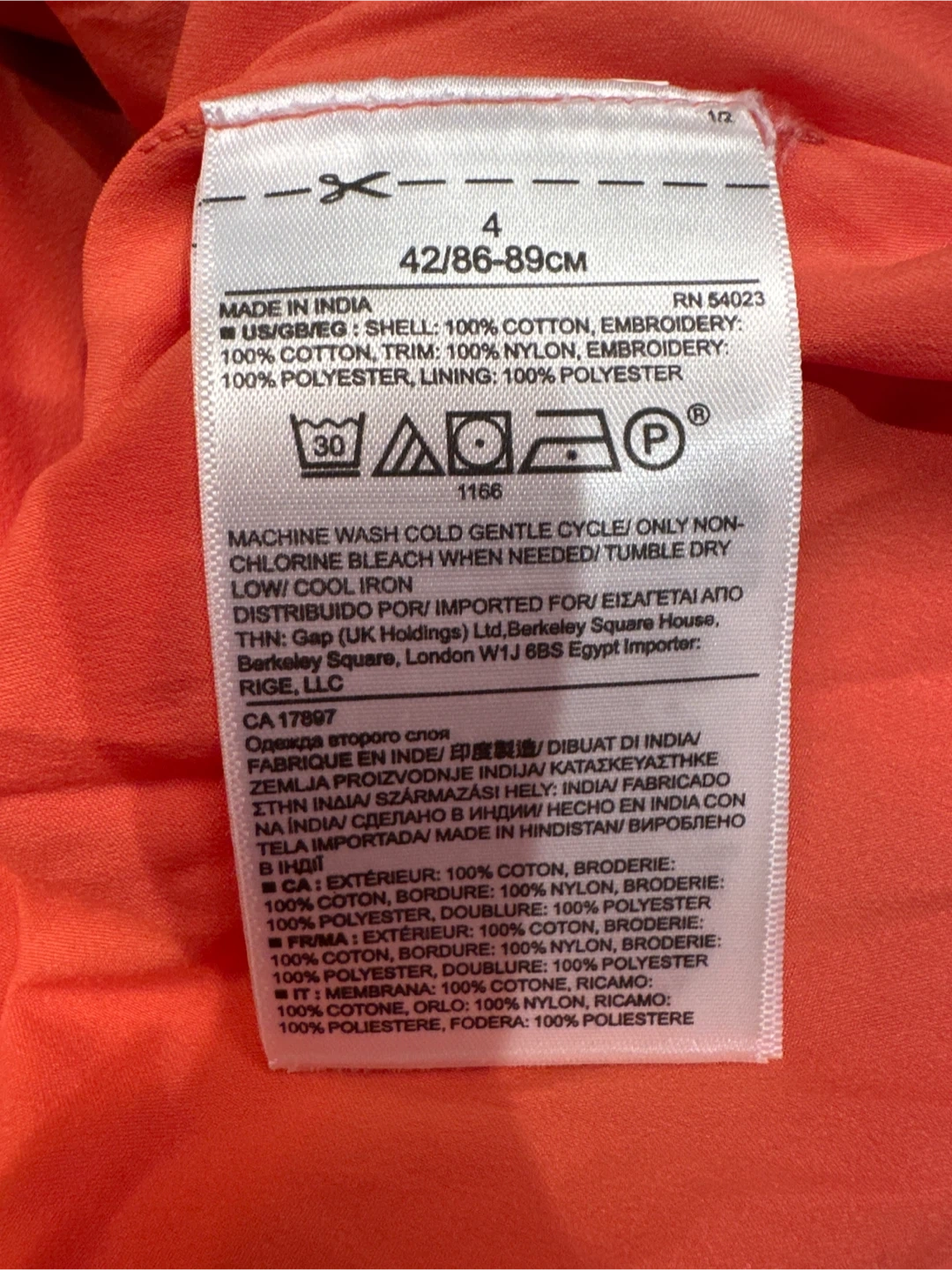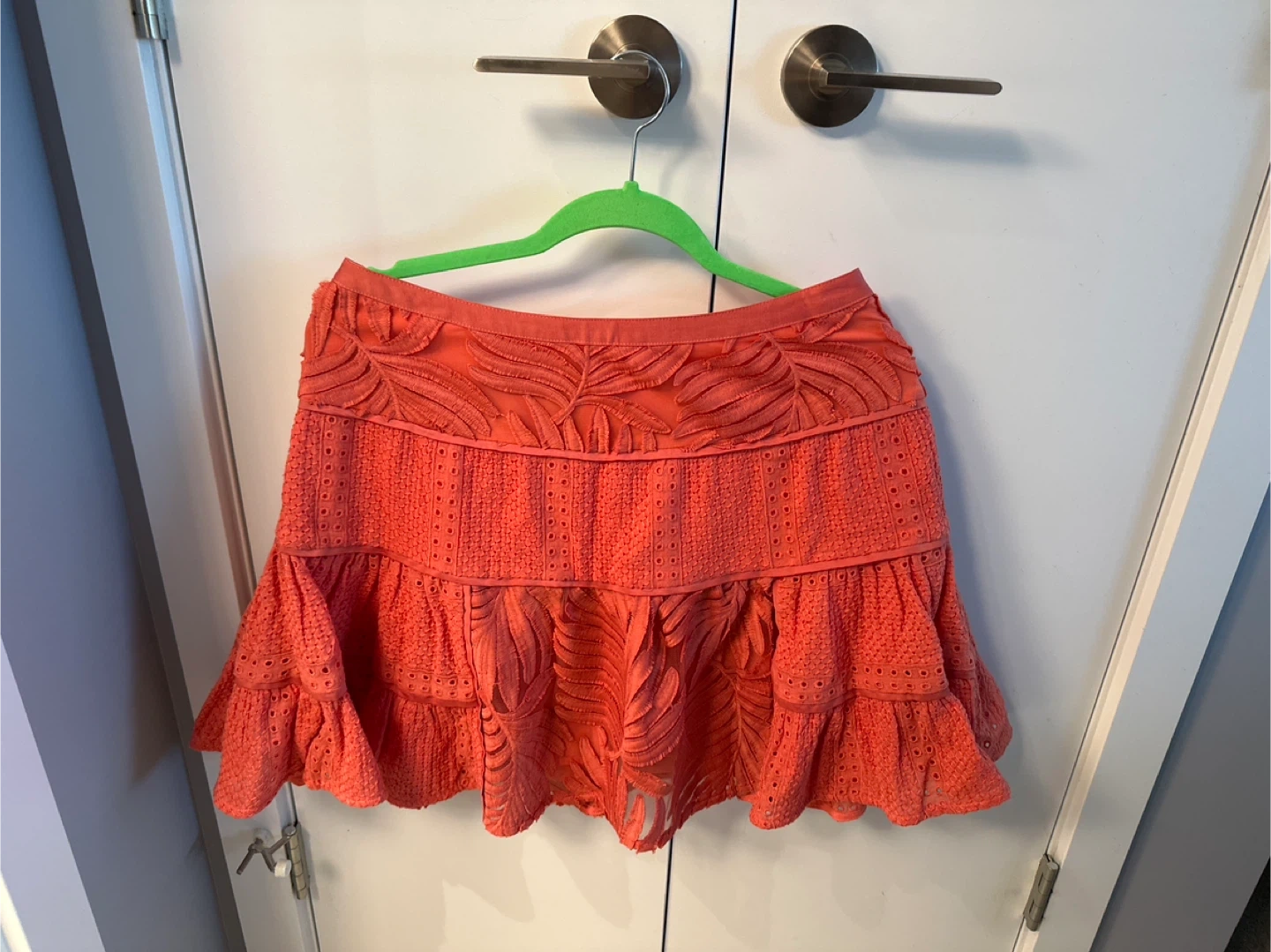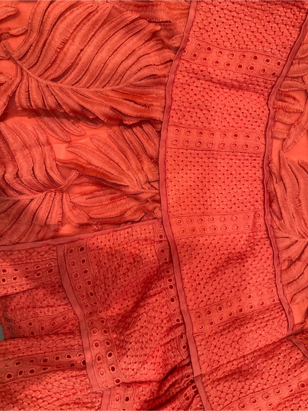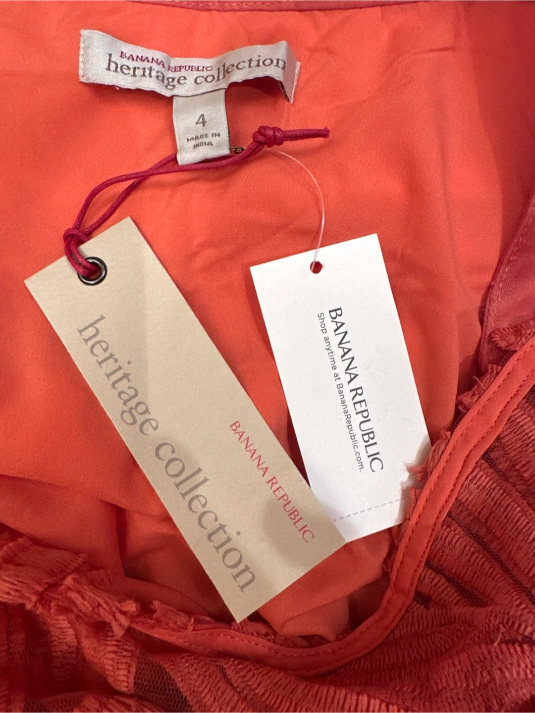 This is a beautiful coral-coloured skirt from Banana Republic's Heritage Collection. It's a size 4 and features intricate embroidery. The skirt is made of 100% cotton shell and embroidery, with a 100% nylon trim and 100% polyester lining. It's brand new and ready for a new home!