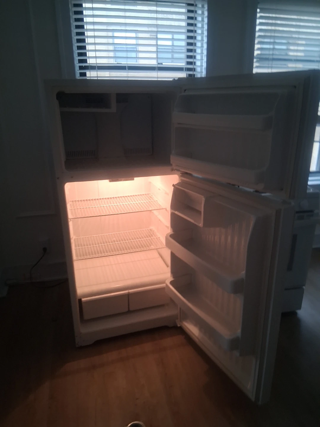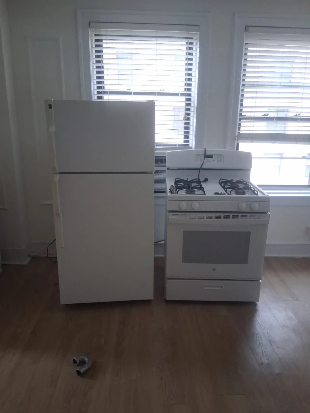 Includes a white GE gas range with four burners and an oven, plus a matching white GE refrigerator. The refrigerator is top-freezer style and the door has been opened for display. Both appliances are in good condition and ready for use.