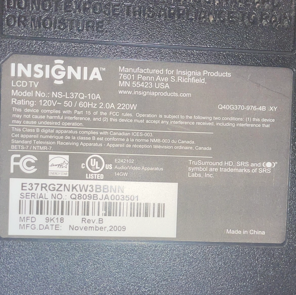 Insignia 37” TV with Remote & Manual