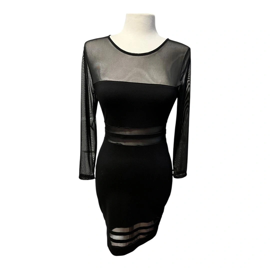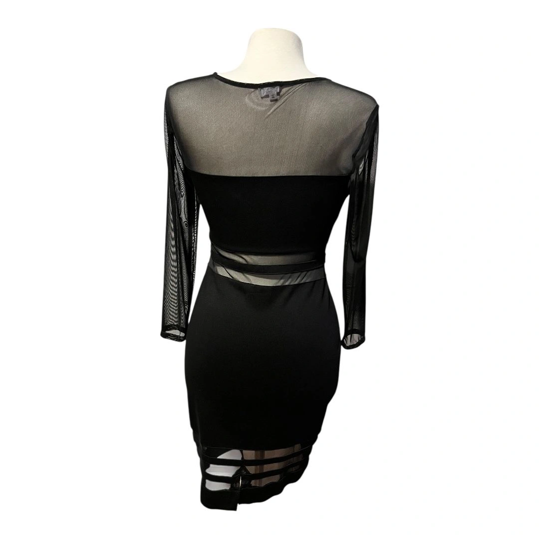 Elevate your evening look with this sleek black bodycon dress from Superdown, designed for cocktail nights out. Featuring a crew neckline and sheer long sleeves, sheer mesh along the waste and chest, and bottom hem. Total length from shoulder to bottom hem 34”. Bust 36” waist 28”-29”. Small 4” slit down the back for easy flow movement. Fabric has some stretch. Excellent condition.