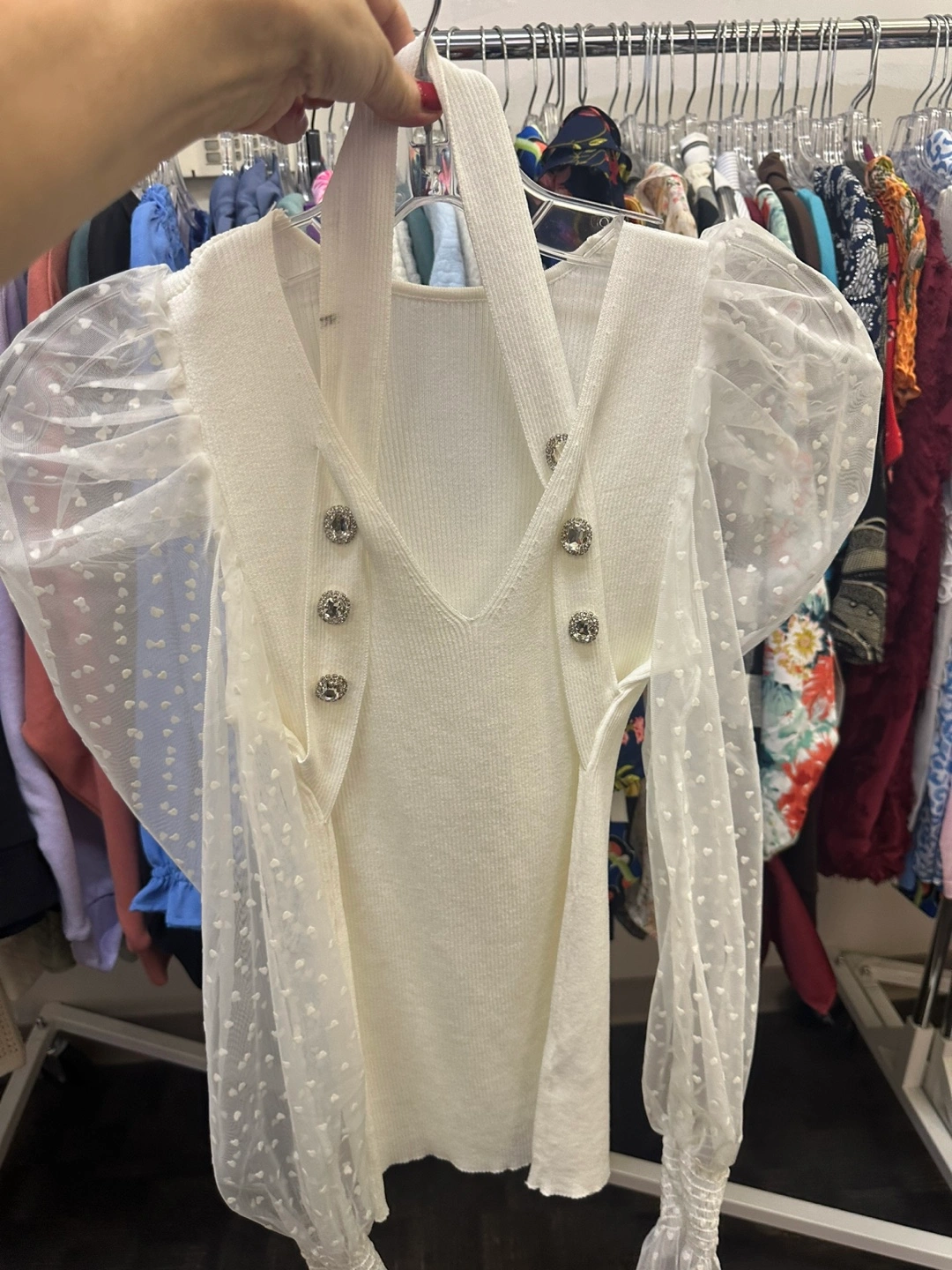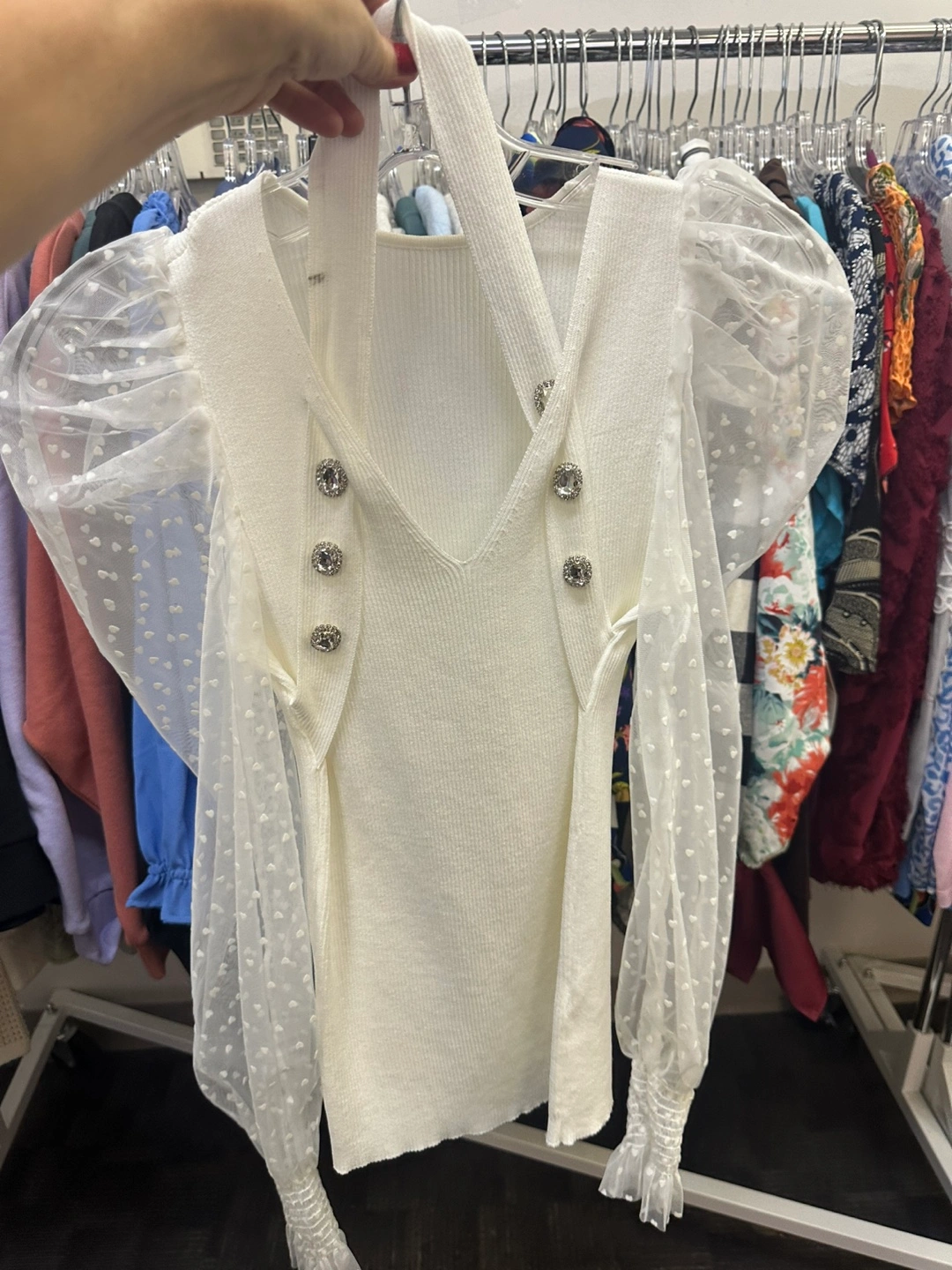 This is a very cute white knit top with sheer sleeves! It has a V-neck and decorative buttons down the front. The sleeves are sheer with a subtle polka dot pattern. Perfect for adding a touch of elegance to your outfit!