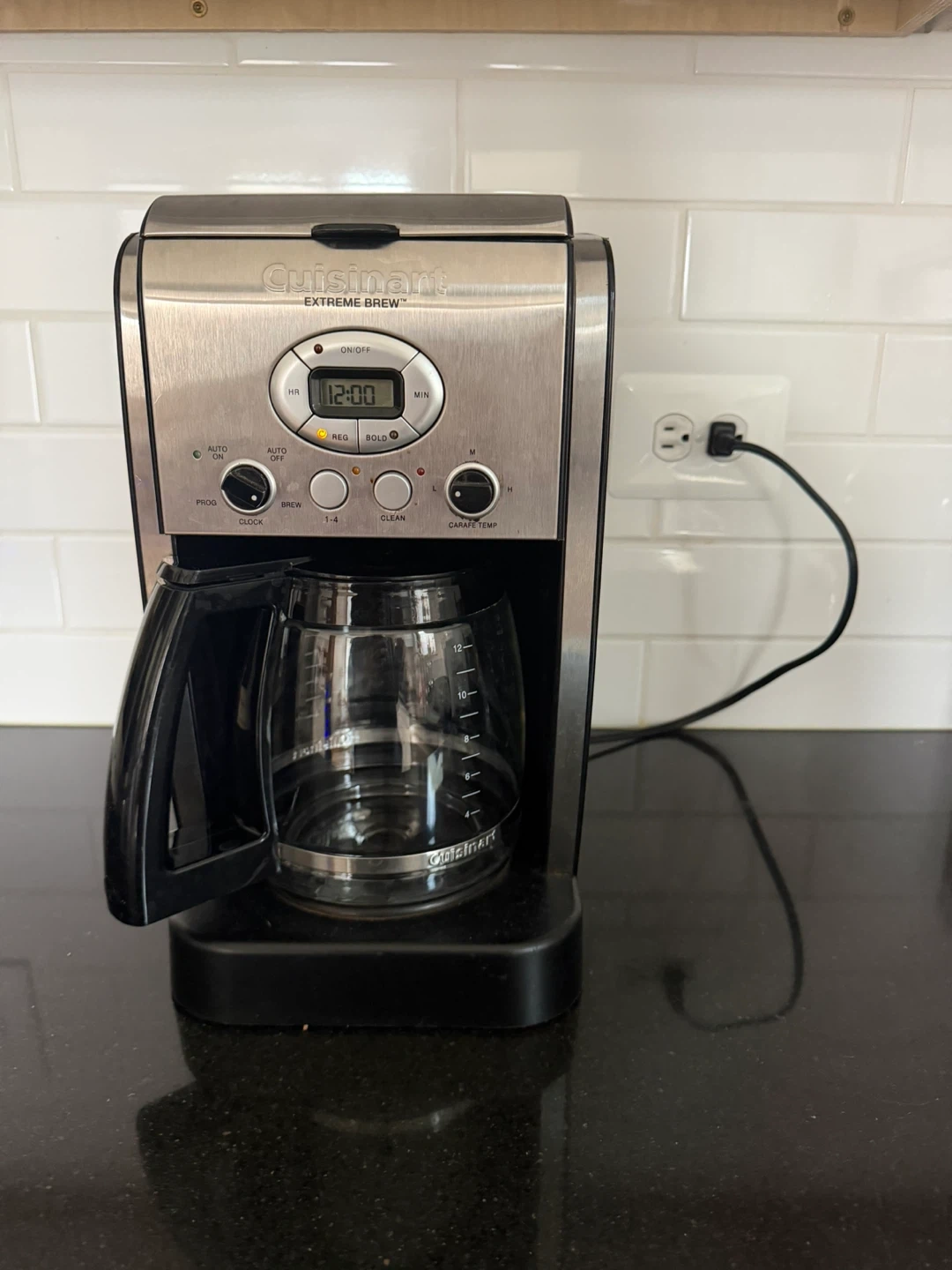 This Cuisinart coffee maker features an Extreme Brew system for fast brewing. It has a 12-cup capacity glass carafe with a water level indicator. The digital display allows for programming brew times and brew strength selection.