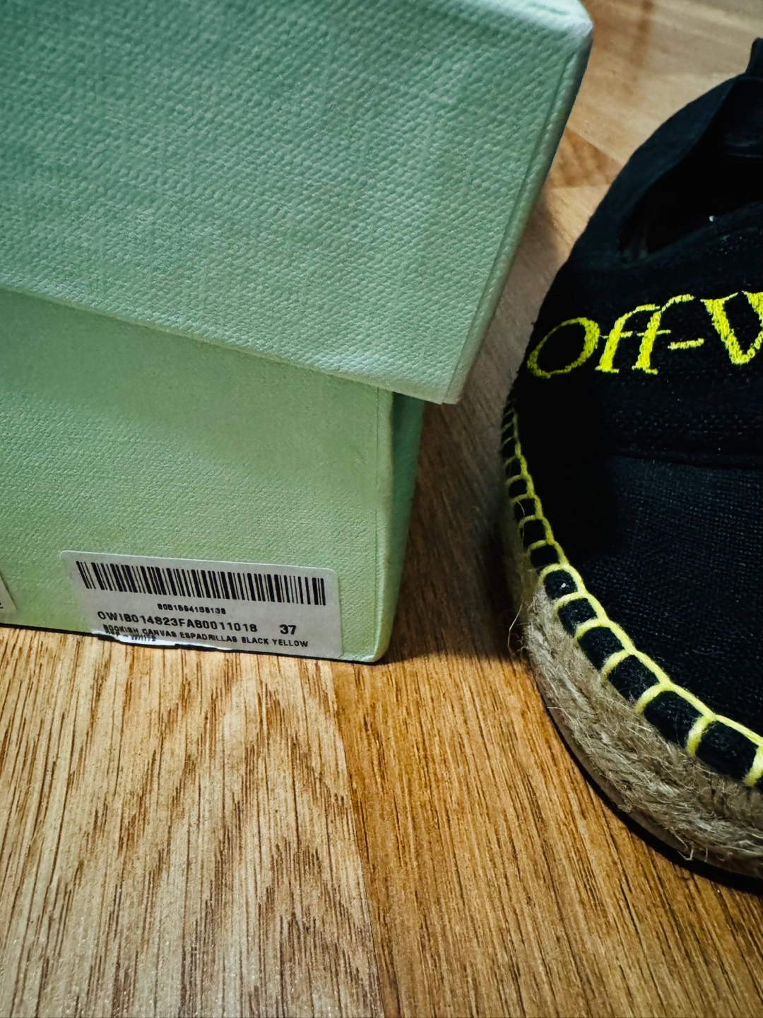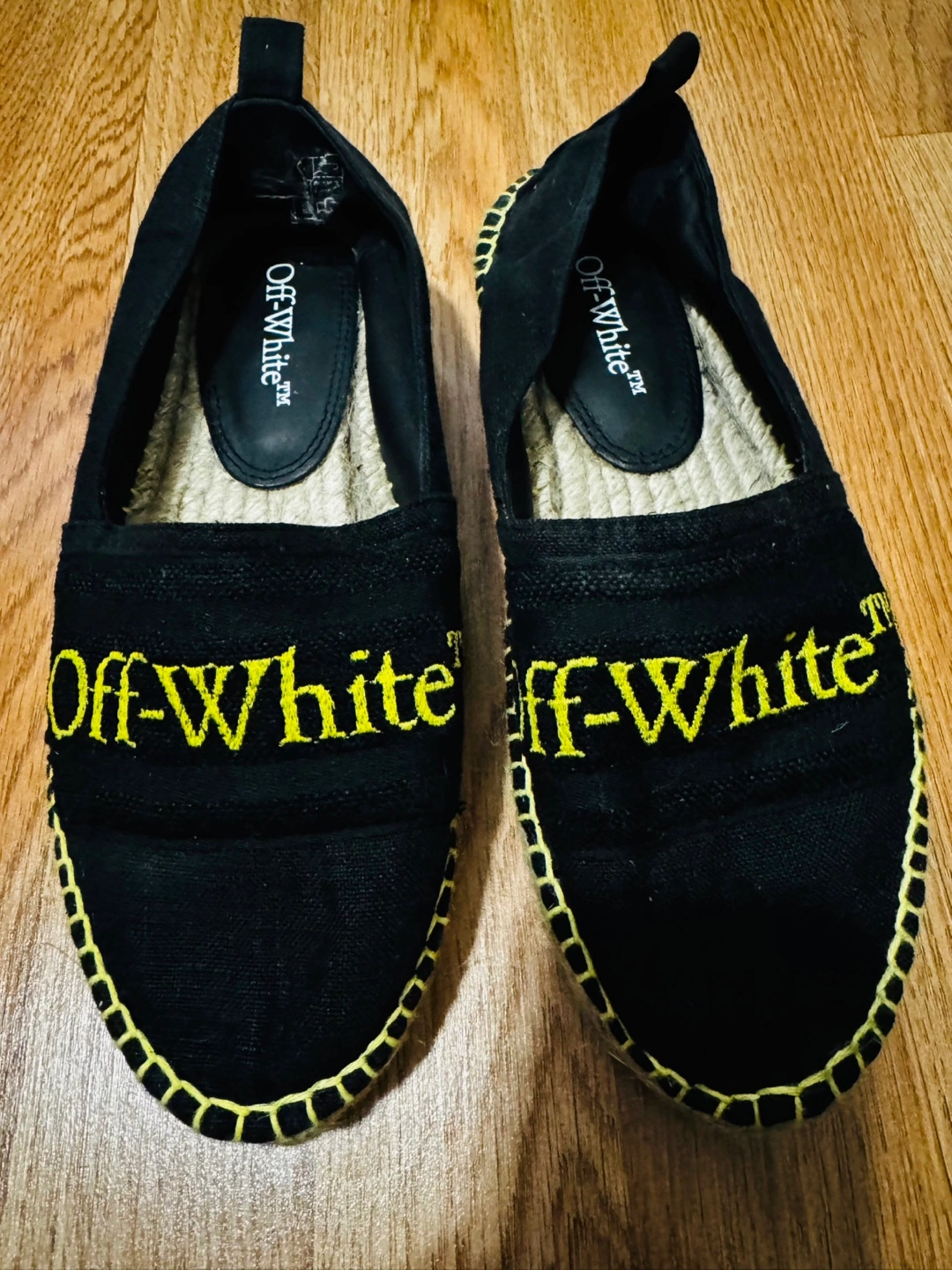 5Used Once. Black canvas espadrilles. Yellow stitching. Off-White branding. Size 37. Comes with box.