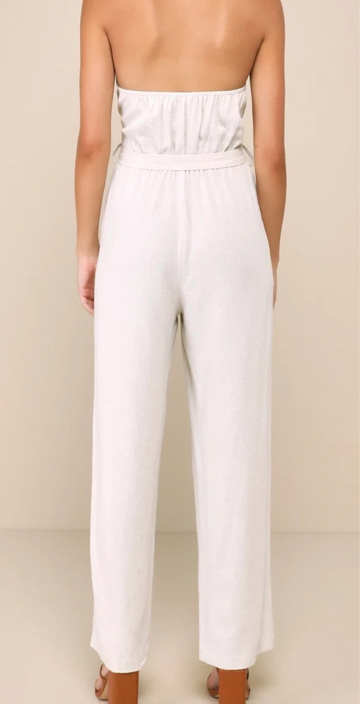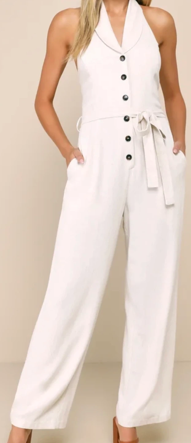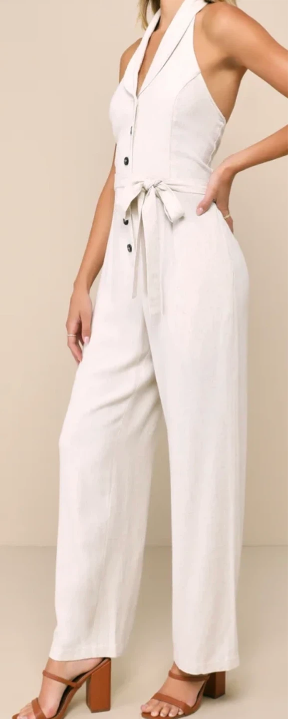This off-white jumpsuit features a stylish tie waist. It is perfect for a casual or dressy look. The neutral color makes it easy to pair with any accessories. The jumpsuit appears to be in great condition and ready for a new owner!