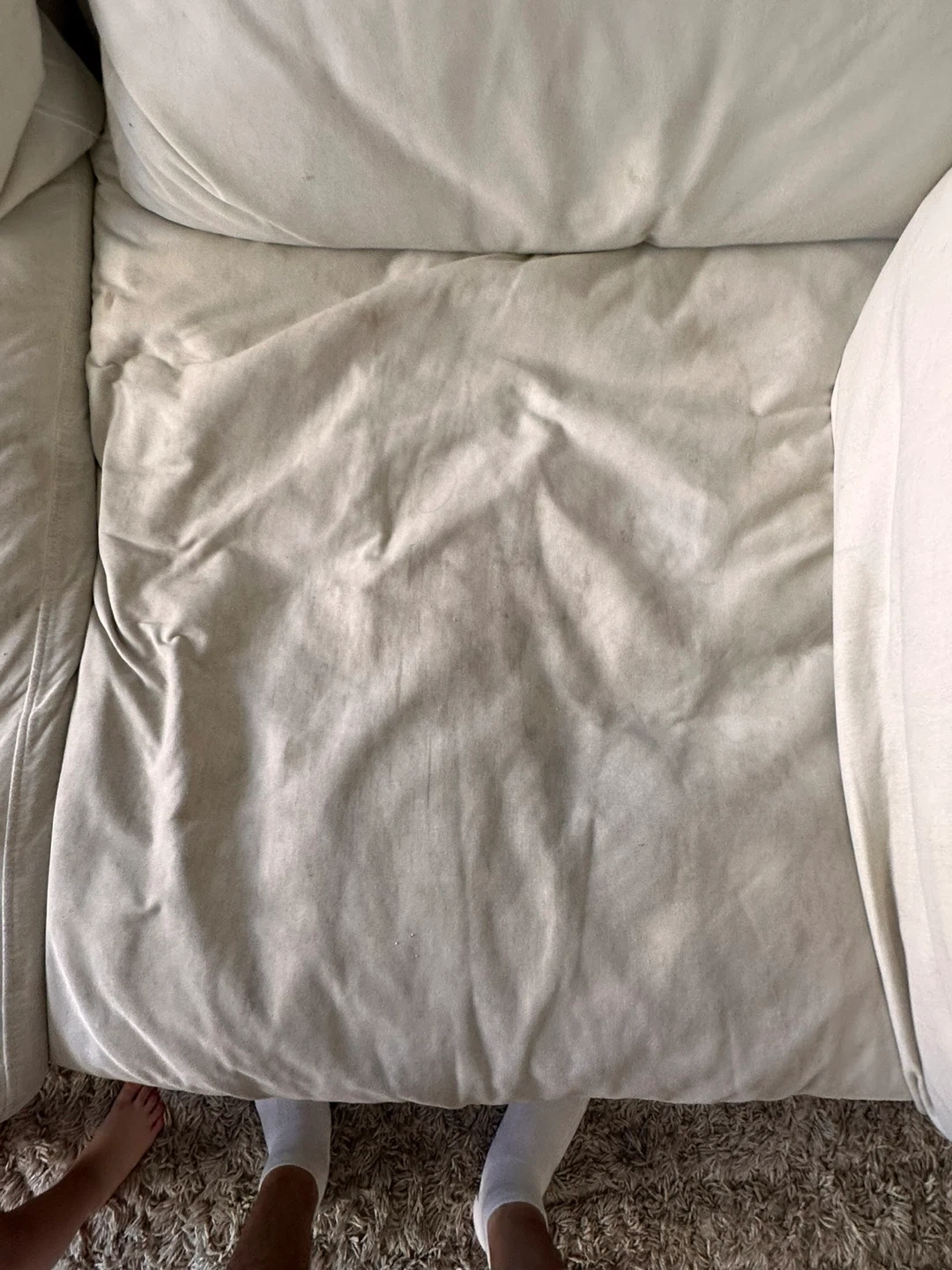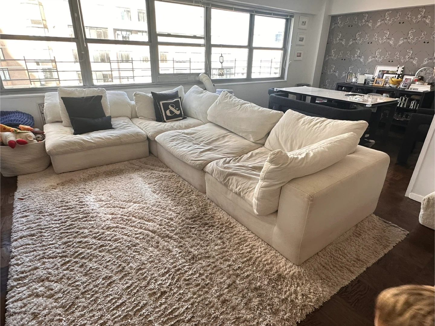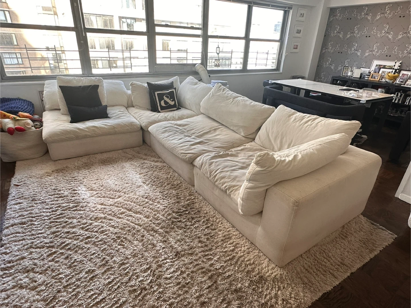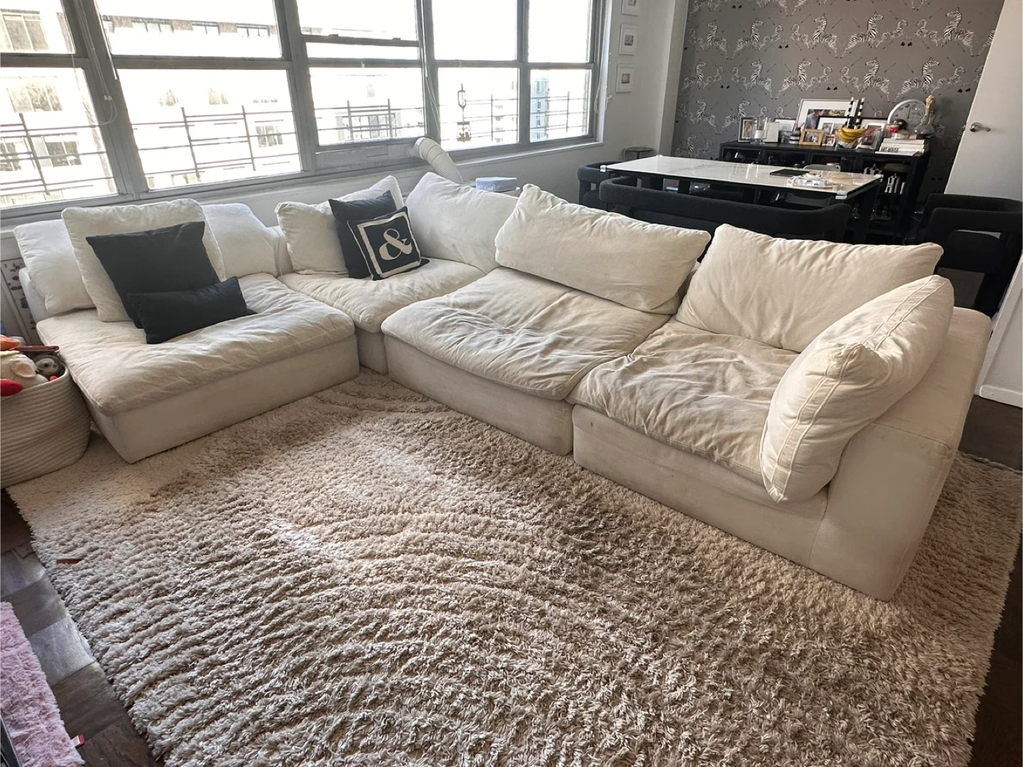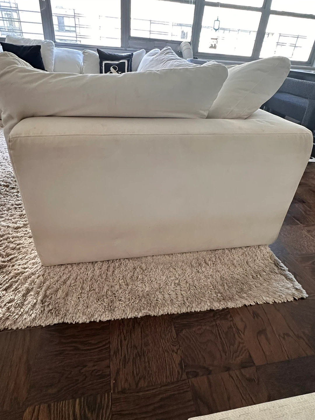Selling an off-white modular sectional sofa. It shows signs of use and wear, so please review the photos carefully. It is a comfortable and versatile piece of furniture for any living space Nixon White Fabric 4-piece Modular Sectional From City Furniture SKU Number: 9714703 Dimensions: 133.50W x 32.00H x 88.50L Arm Height - Top of Arm to Floor (in inches): 24 Assembly Required: No Back Cushion Fill Material: Down Blend Back Cushion Thickness (in inches): 7.8 Back Cushion Type: Removable Back Height - Seat to Top of Back (in inches): 11.5 Construction: Engineered wood frame Fabric Color: White Features: Easy to Clean Fabric, LiveSmart performance fabric, Performance Fabric Frame Material: Engineered Wood Height Assembled (in inches): 32