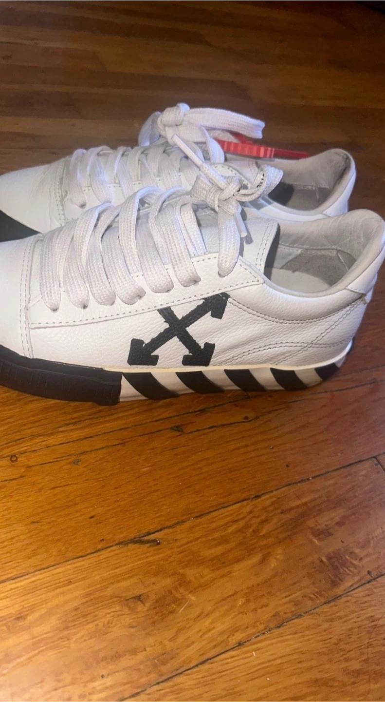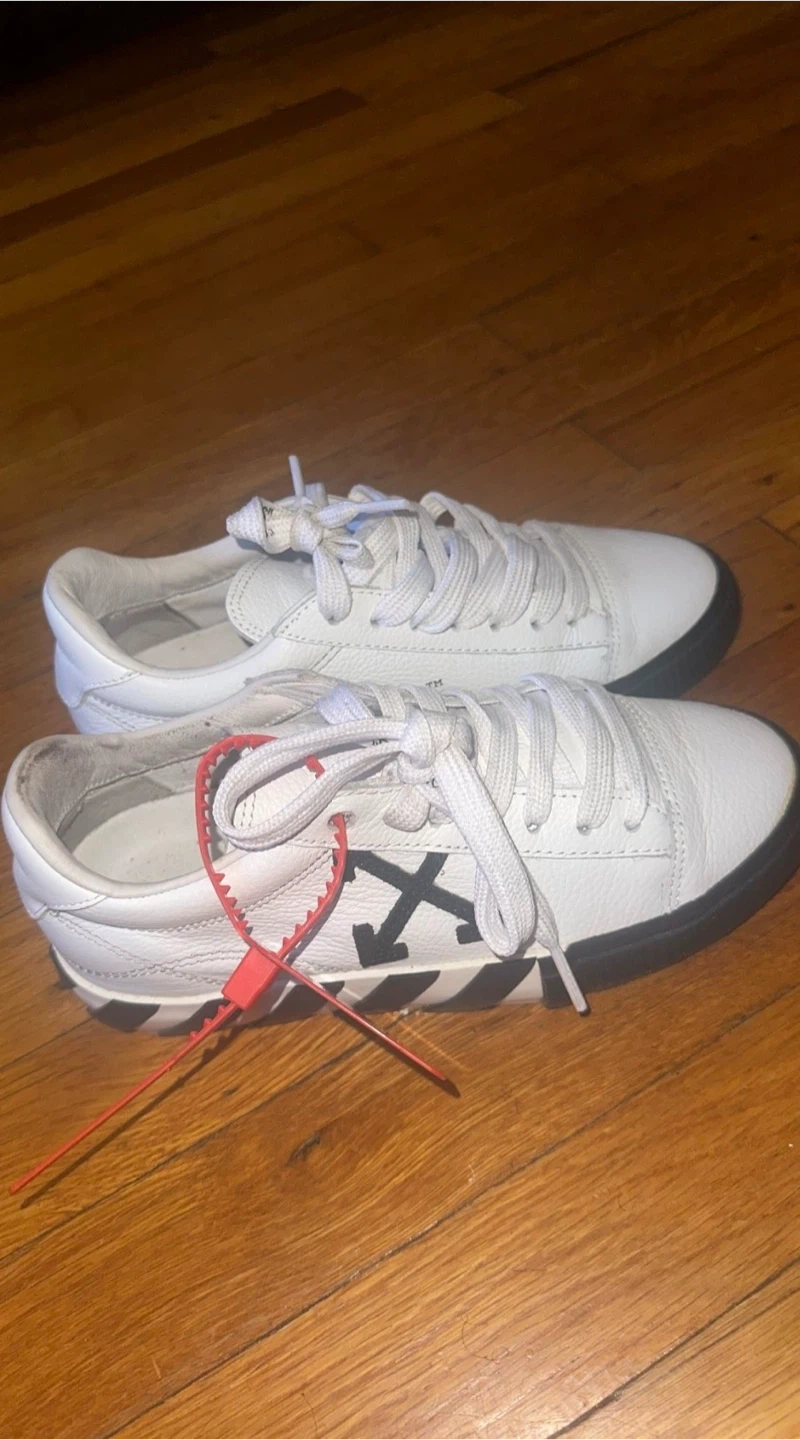 Selling a pair of Off-White white leather sneakers. They feature the iconic Off-White arrow design and striped sole. Great for adding a stylish touch to any outfit!