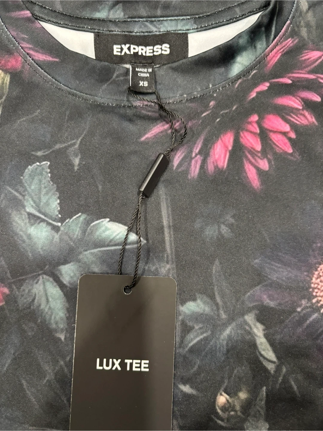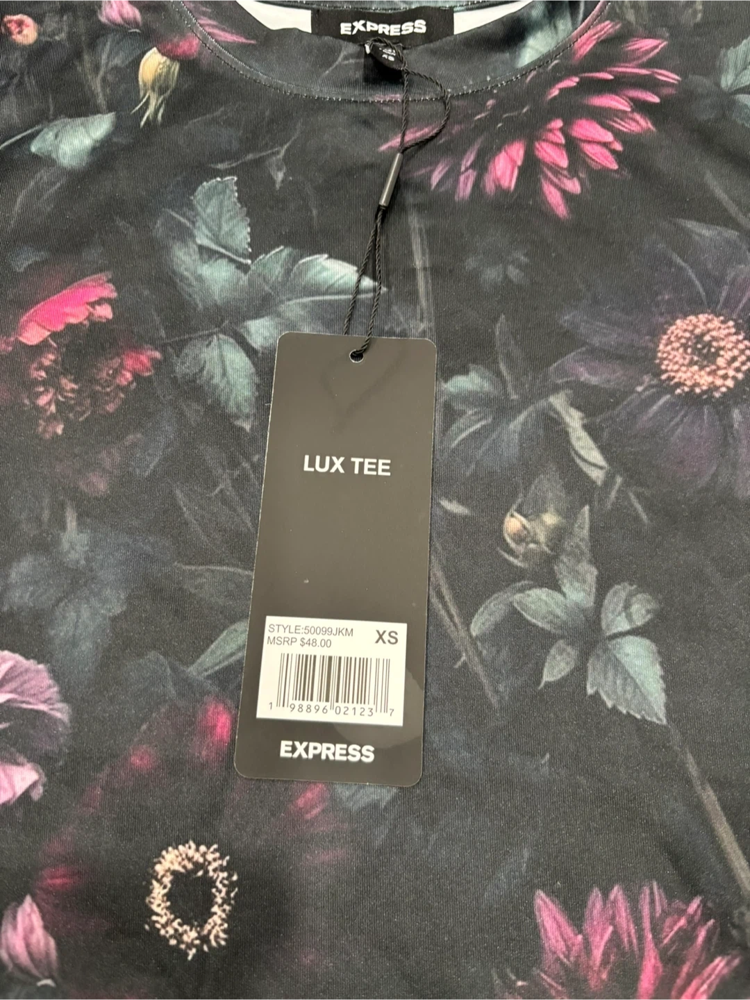 This is a brand new Express Lux Tee in size XS. It has a beautiful floral print and is in excellent condition. The style number is 50099JKM and it originally retailed for $34