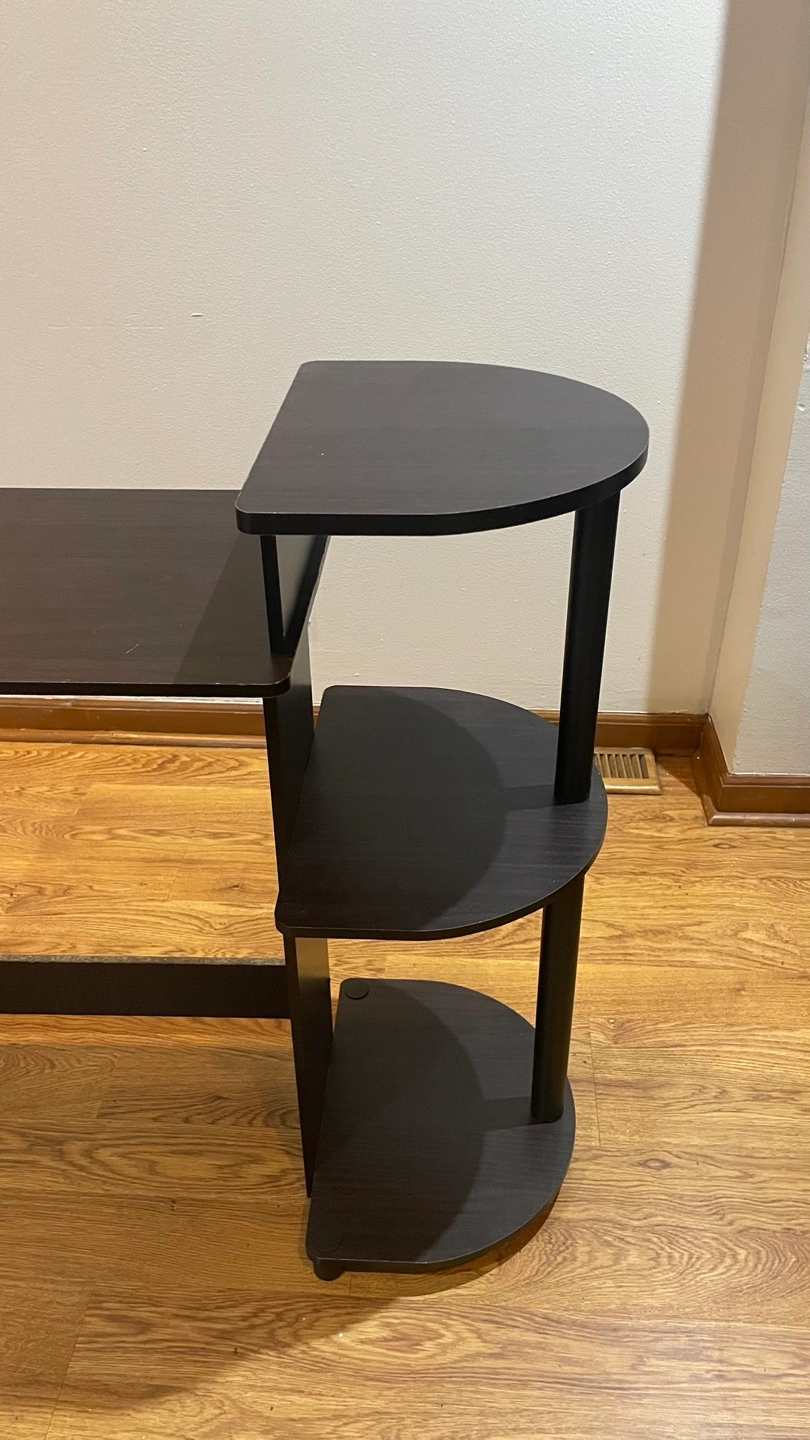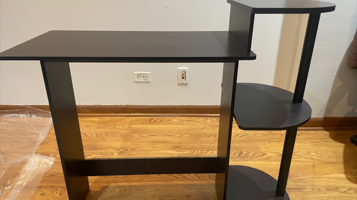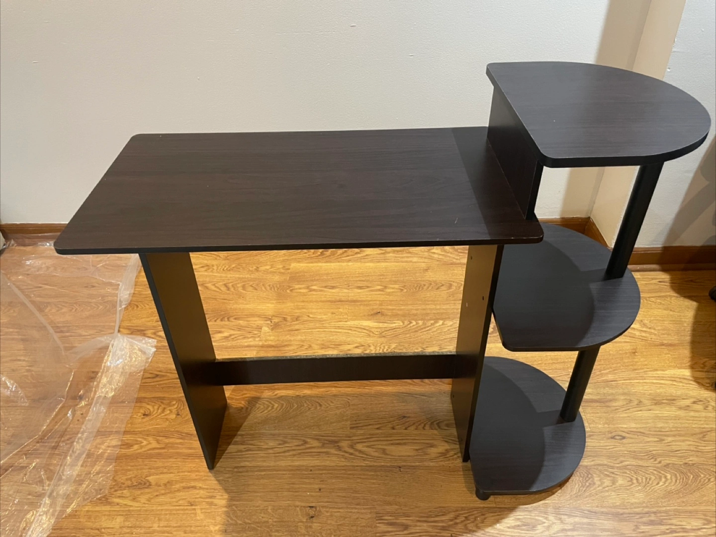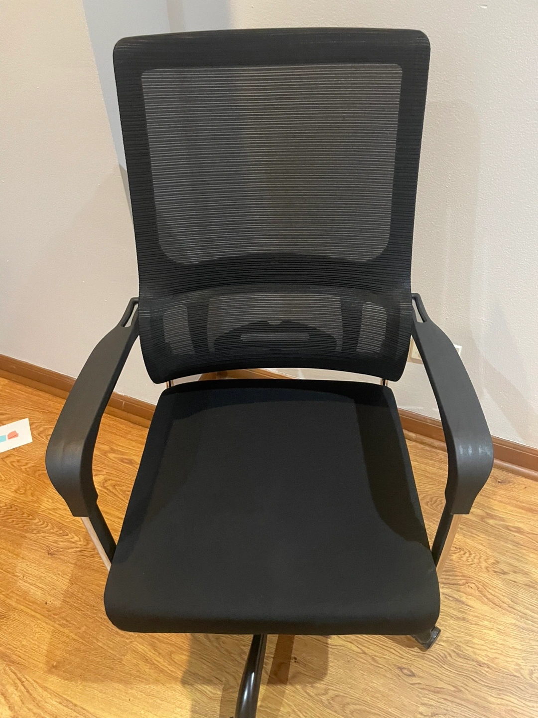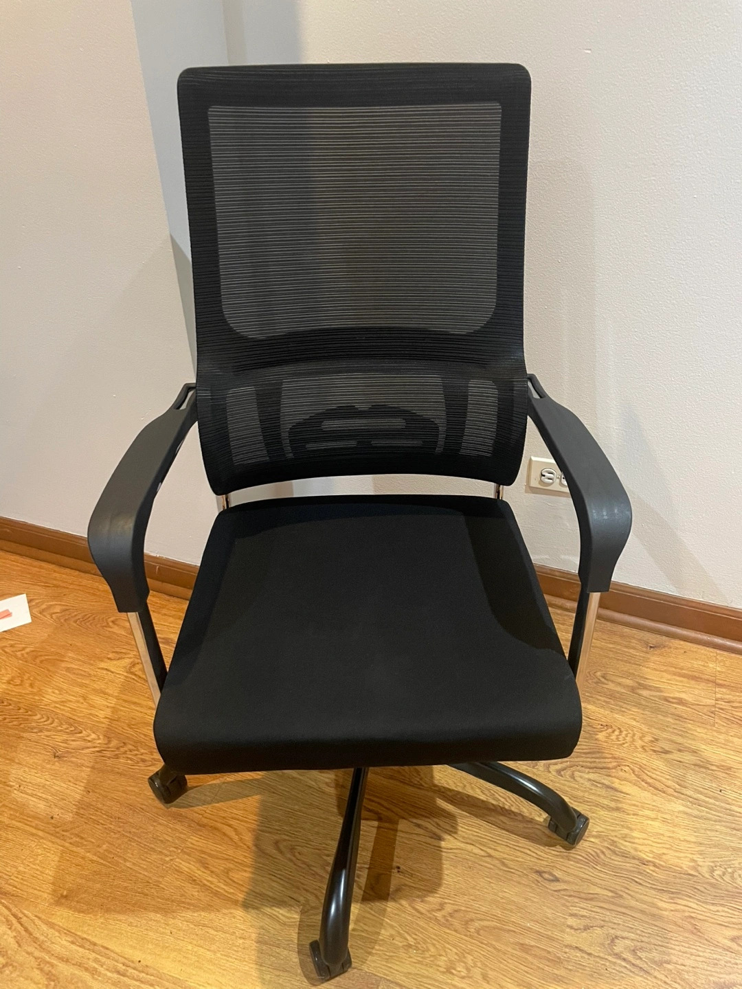 The chair has a mesh back, armrests, and a black seat. Its base is made of metal. The desk has a tabletop and side shelves. A great place to sit back and relax.