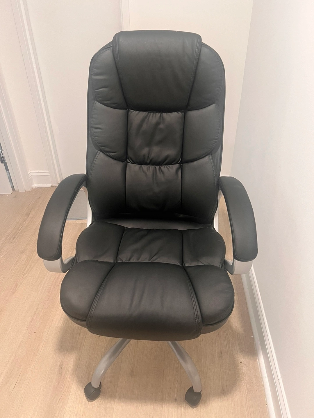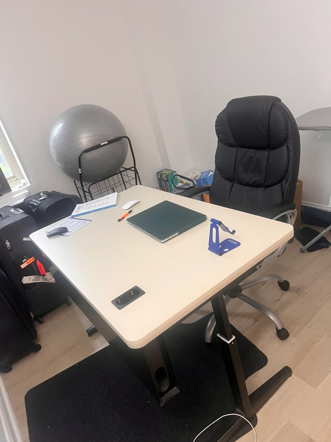 Rectangular desk with a sleek design. Adjustable height. Rolling office chair with a high back. The chair offers a comfortable workspace for long hours, helping you get things done.